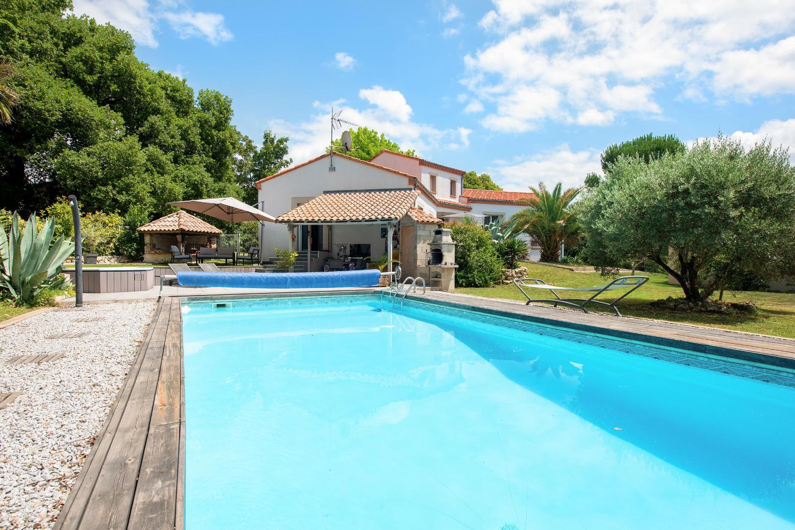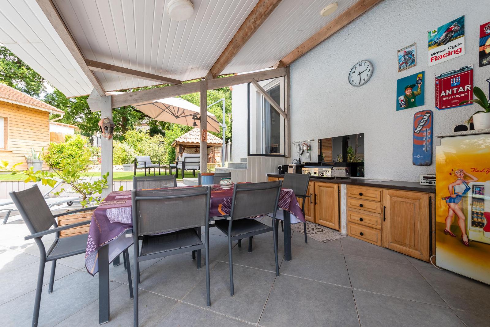 À l'extérieur, un magnifique jardin paysager de 2 137 m² avec une cuisine d'été, une piscine et plusieurs espaces de détente. Au bout du terrain, une seconde maison indépendante de 43 m² comprenant une cuisine, un séjour, ainsi que deux chambres.