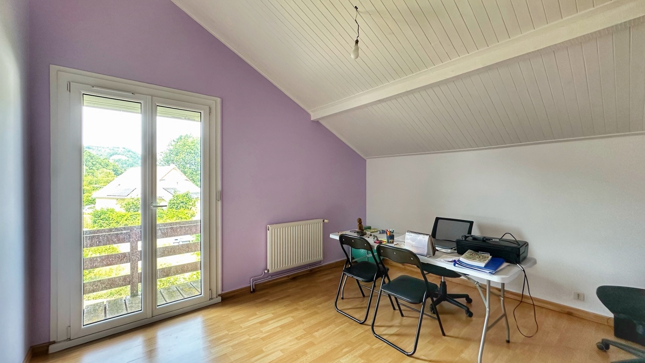 A l’étage un pallier dessert une chambre de 14 m² avec balcon, 2 chambres avec placard (12,31 m² avec galetas de 9 m² et 15,65 m²) et un grenier de 5,61 m².