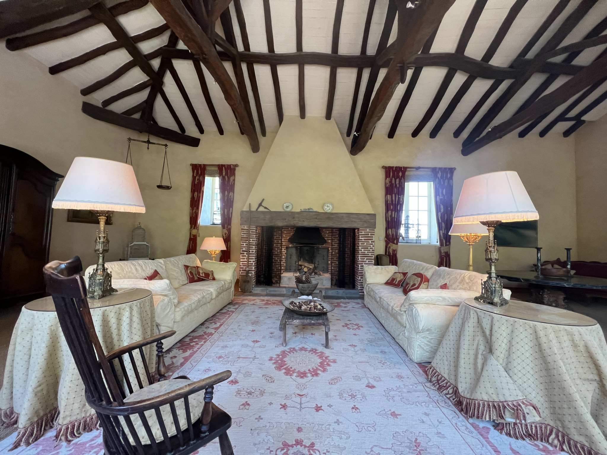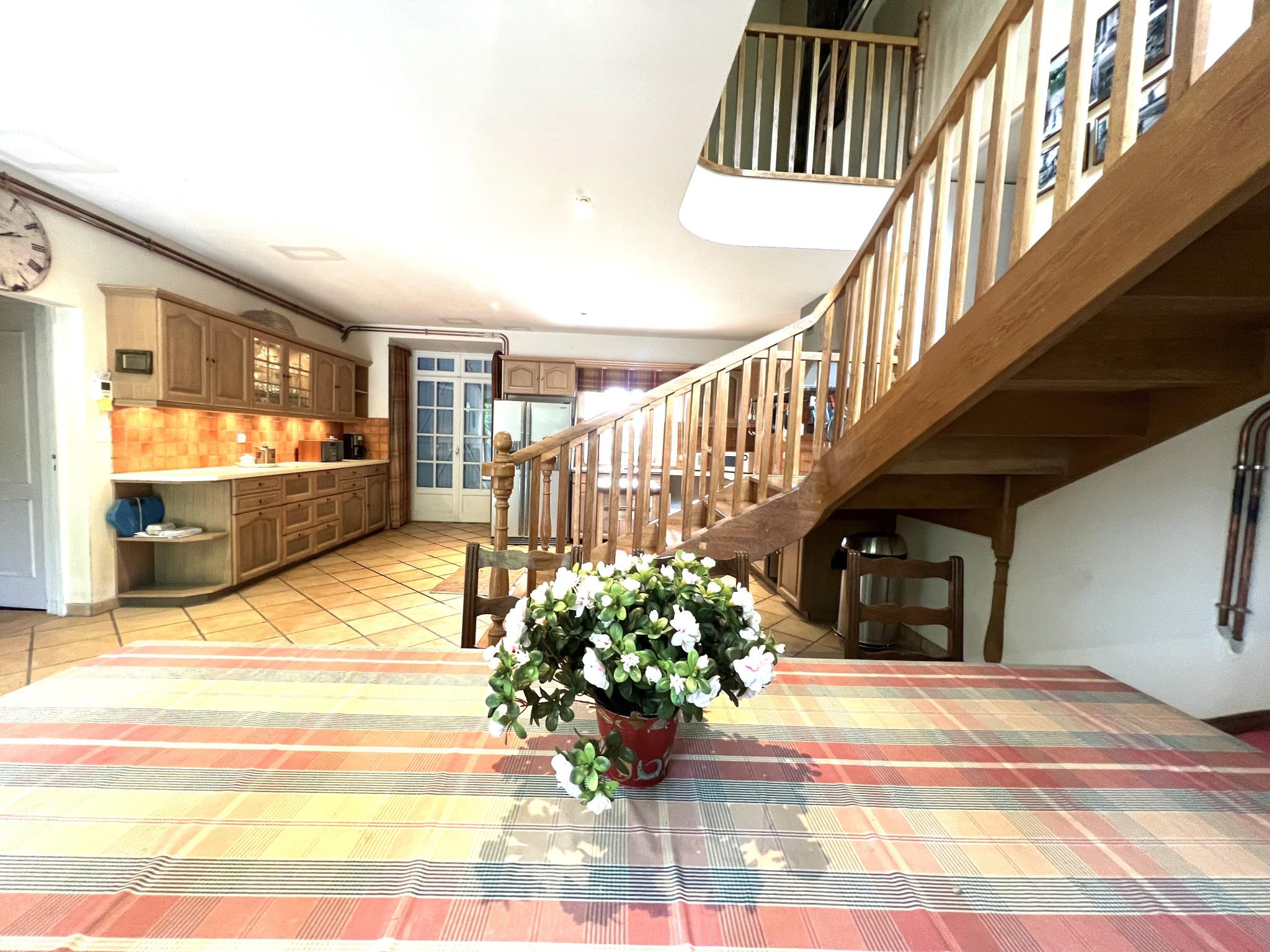 La porte d'entrée principale mène directement à une grande cuisine/salle à manger (43m2). Elle offre une double vue sur les jardins avant et arrière. L'impressionnant escalier mène à un salon encore plus impressionnant (90m2). Cette vaste pièce, avec son immense cheminée et ses poutres rustiques, est remplie de lumière grâce aux grandes fenêtres et à l'orientation sud-ouest. Il y a également une autre pièce à mi-chemin de l'escalier que le propriétaire utilise comme bureau/petite salon(27m2). On peut également accéder à cette pièce par l'autre entrée située à l'extrémité de la propriété. Les chambres sont situées dans les ailes droite et gauche de la maison, ce qui constitue une séparation idéale si vous souhaitez disposer d'un espace séparé pour les invités et d'un logement pour les propriétaires à l'autre extrémité. Ainsi, si vous entrez par l'autre porte principale à l'extrémité de la piscine, vous entrez dans un couloir, et à l'étage se trouve une chambre principale (18m2) avec balcon et salle de bain attenante (9m2). A l'étage, à cette extrémité, se trouve une autre grande pièce de 25 m2 qui comprend également une salle de bain. Depuis l'entrée de la cuisine à gauche, vous avez l'autre aile de chambres à coucher, toutes au rez-de-chaussée. Idéal pour les personnes à mobilité réduite.