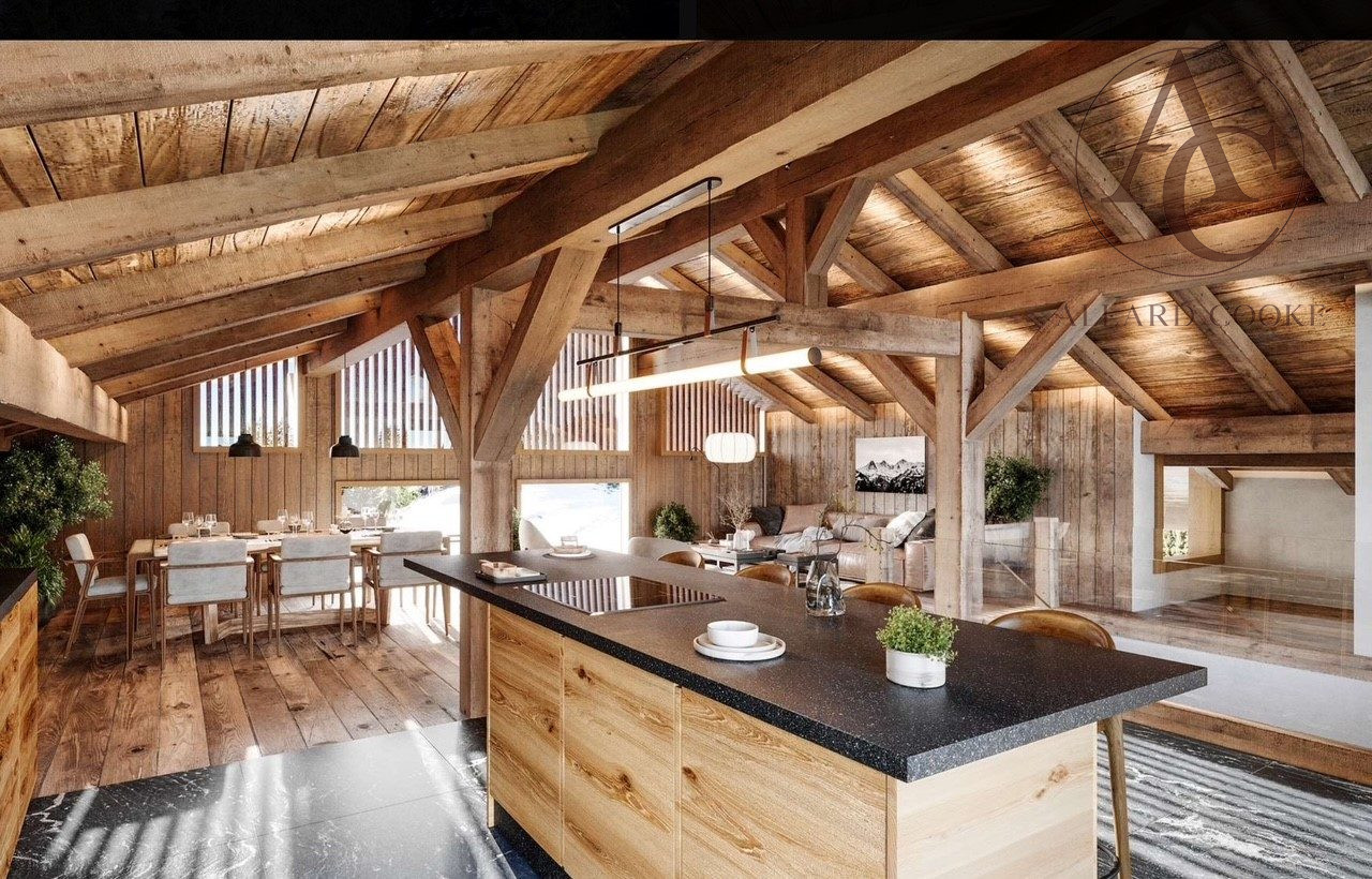 Accessible en 4x4 l'été ou en Ski-Doo l'hiver, il off re un cadre calme et intime, avec une vue dégagée sur le massif des Aravis. Ce chalet authentique, l'un des derniers de ce secteur, sera entièrement rénové dans la tradition alpine. Il off rira une surface habitable de 181 m² et comprendra cinq chambres dont une suite parentale et un coin montagne, deux salles de bains, deux WC, un vaste salon avec cuisine ouverte, un grand dressing, un ski-room, ainsi qu'une cuisine d'été couverte