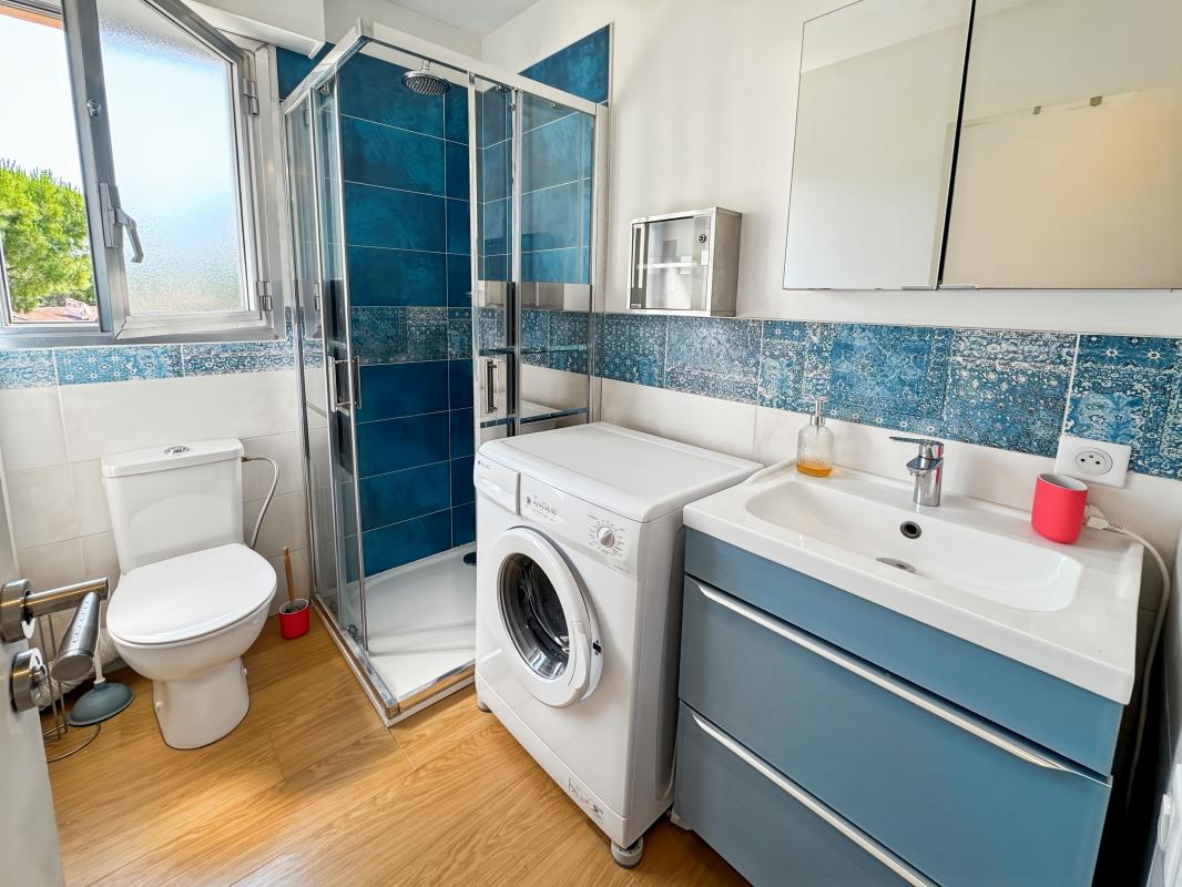 Dans une résidence fermée avec piscine, joli studio traversant au dernier étage. Il dispose d'une grande terrasse exposée au sud avec aperçu mer, d'une climatisation et se trouve au calme absolu. Cave et parking inclus. Quartier résidentiel, proche des commerces et des transports. Un pied-à-terre idéal ou un bon investissement locatif.