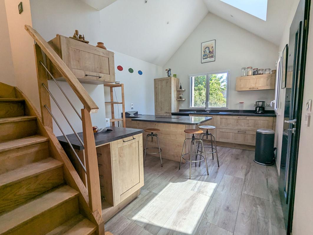Une pièce de vie lumineuse ouverte sur la cuisine aménagée équipée, une cellier, wc