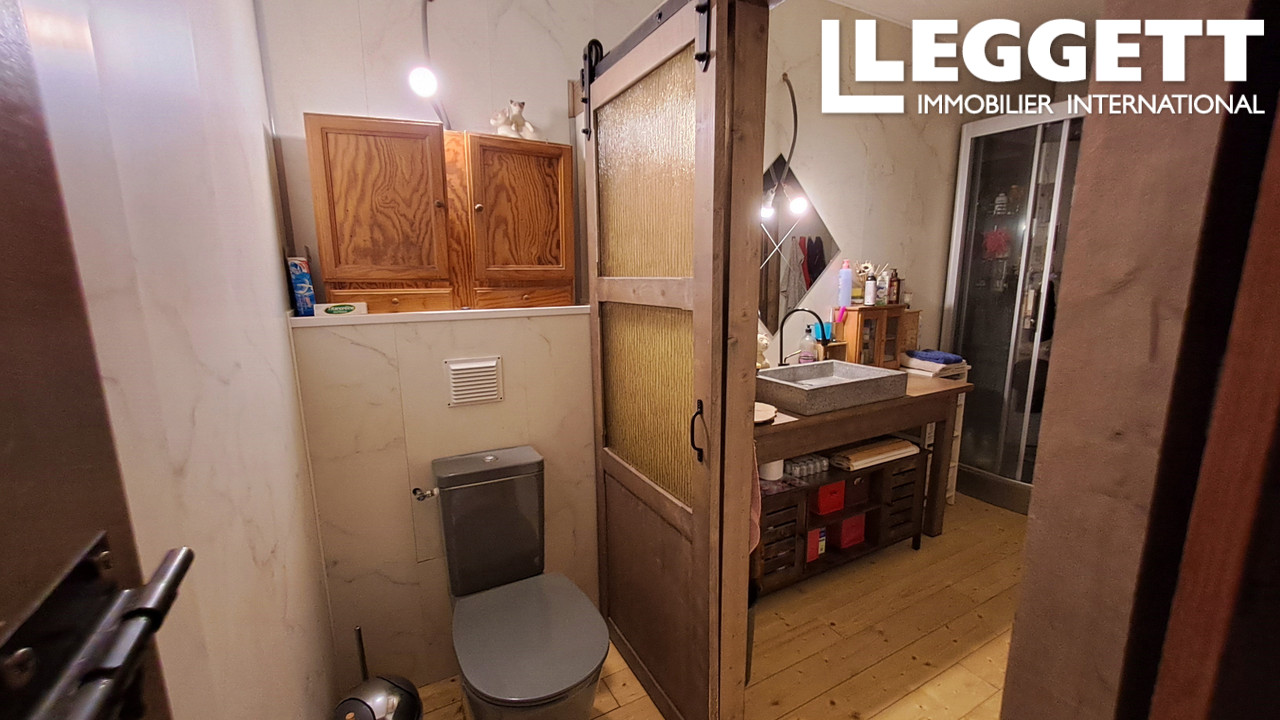 Le logement comprend actuellement une cuisine équipée / salle à manger au rez-de-chaussée, menant à une chambre avec salle de douche et WC. Cette pièce possède une porte-fenêtre donnant sur la cour.
