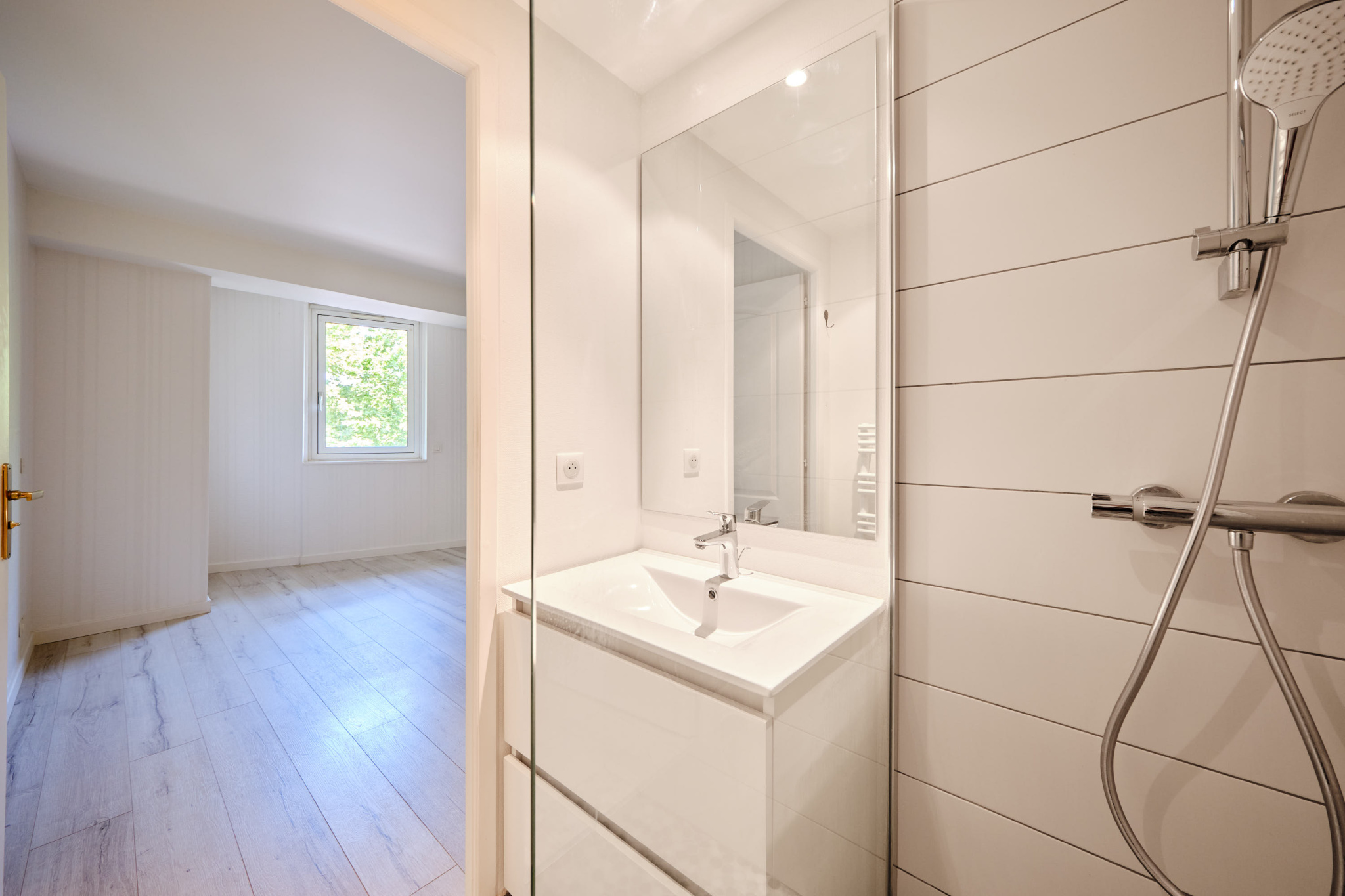 Dès l'entrée, vous bénéficiez d'un espace de rangement intégré. La pièce de vie, spacieuse et lumineuse, s'ouvre sur une belle terrasse exposée sud-est, sans vis-à-vis, avec une vue entièrement dégagée sur le parc. La cuisine semi-ouverte complète cet espace convivial. Le coin nuit est bien séparé. Il comprend une suite parentale avec salle d'eau privative, ainsi qu'une seconde chambre avec placards, qui dispose de son propre accès à un balcon exposé nord-ouest. Une deuxième salle de bains indépendante ainsi que des WC séparés viennent compléter l'aménagement.