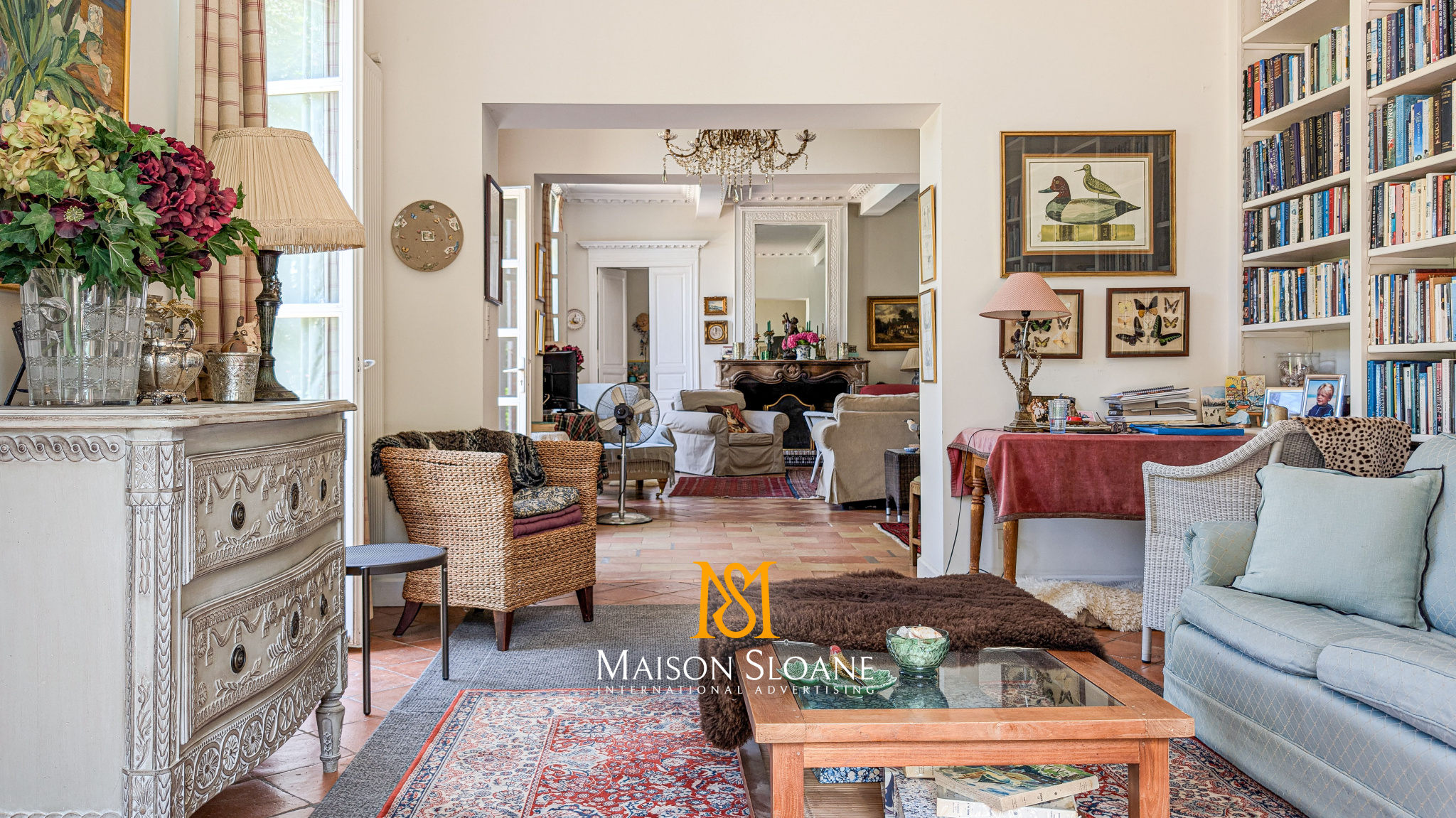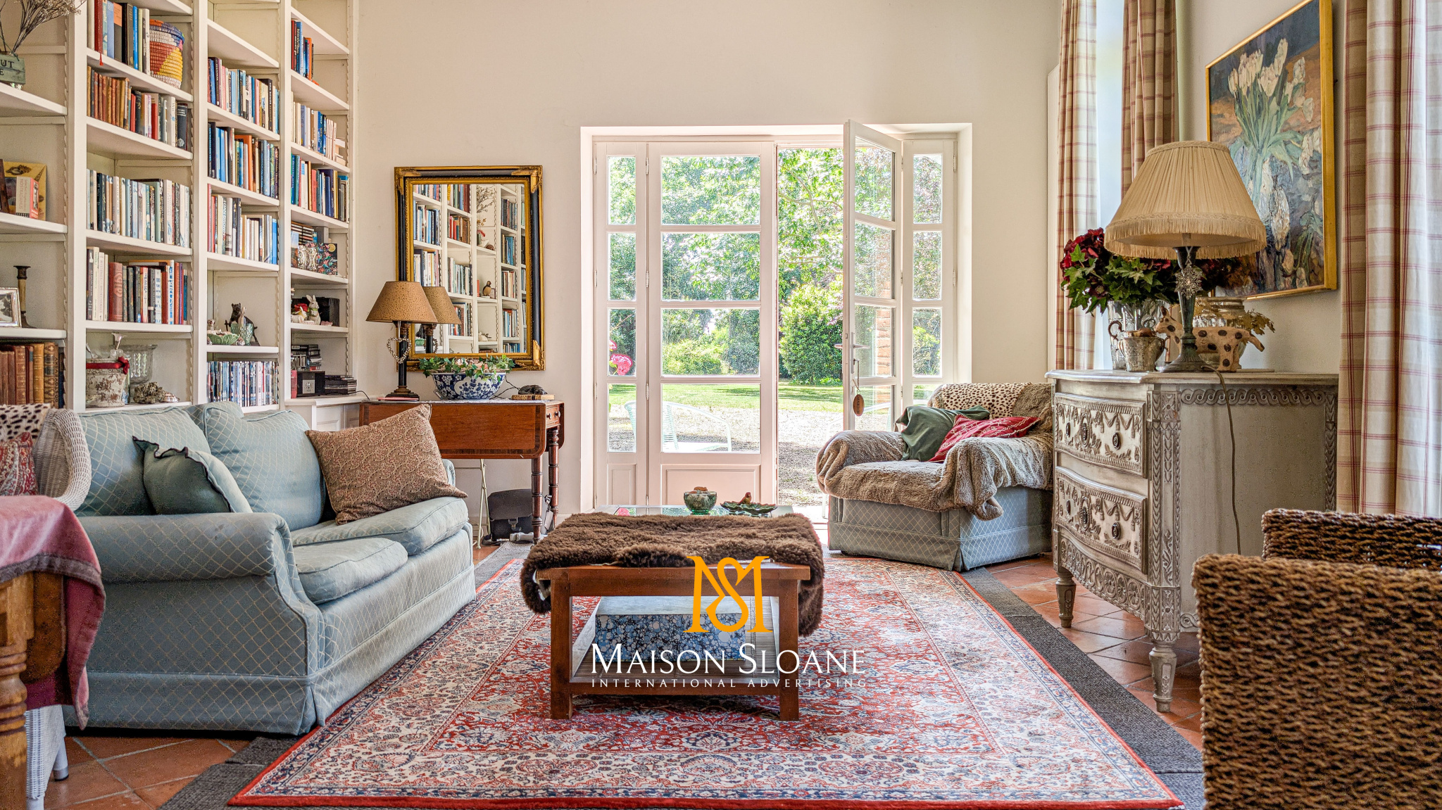 Conçue pour être appréciée toute l'année et parfaite pour recevoir en été, la pièce de vie principale s'ouvre sur une vaste terrasse pavée grâce à six portes-fenêtres, offrant une transition fluide entre intérieur et extérieur.