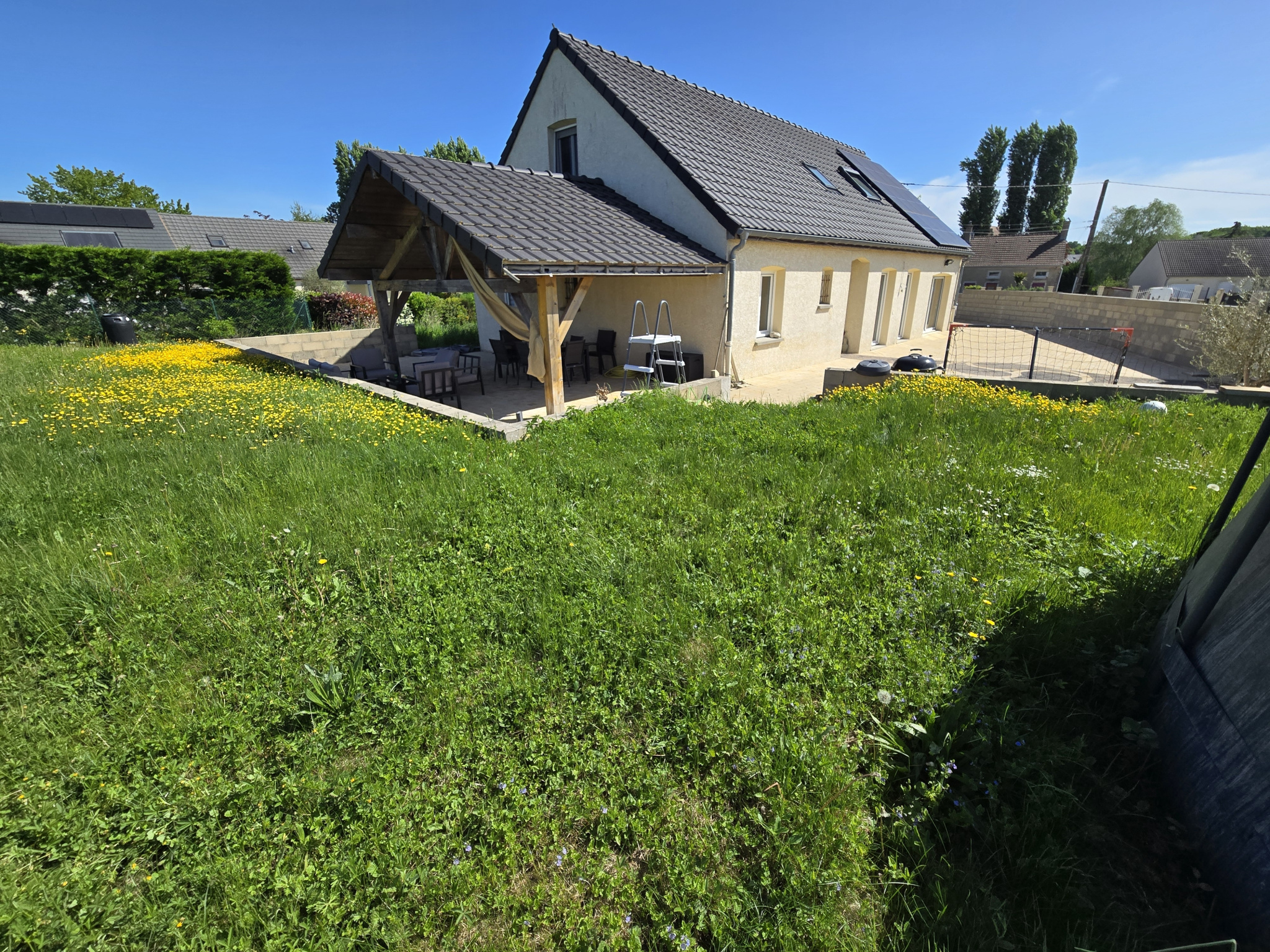 Celle-ci comprend : - Au rez-de-chaussée : Cuisine ouverte sur salon/séjour de 49m2, 2 chambres avec placards (20,30m et 10,22m2), une chambre de 20,33m2 donnant accès à terrasse couverte de 22m2 (possibilité agrandissement salon/séjour ou création chambre supplémentaire), salle d'eau de 6,88m2, wc indépendant de 1,57m2 et espace buanderie de 9,16m2. Garage double attenant de 50m2. Appentis sur le côté. -A l'étage : 3 chambres de 12m2, 13,80m2 et 7,66m2 ( AU SOL : 20m2, 18,82m2 et 9,70m2), salle d'eau de 3,92m2 (5,85m2 au sol) et wc indépendant de 1,35m2. Panneaux photovoltaiques et chauffe eau thermodynamique. Terrain clos et arboré de 1264m2