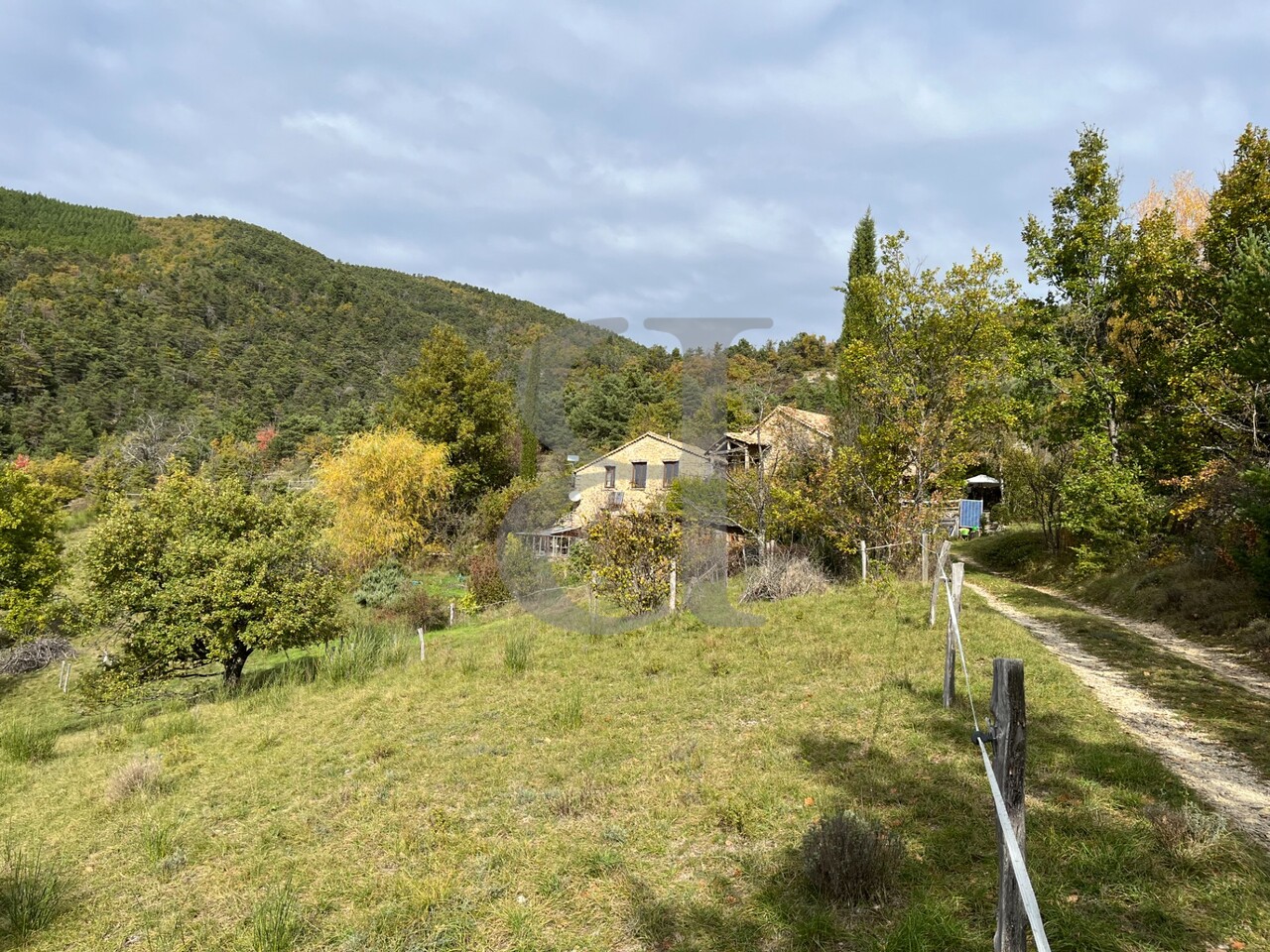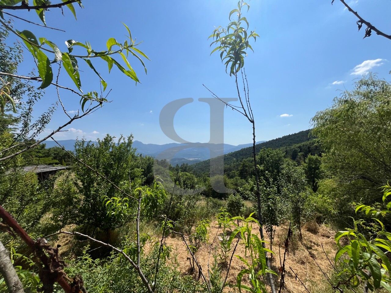 Le terrain, d’une superficie d’environ 10 hectares majoritairement boisés, bénéficie d’une vue dégagée sur la vallée.