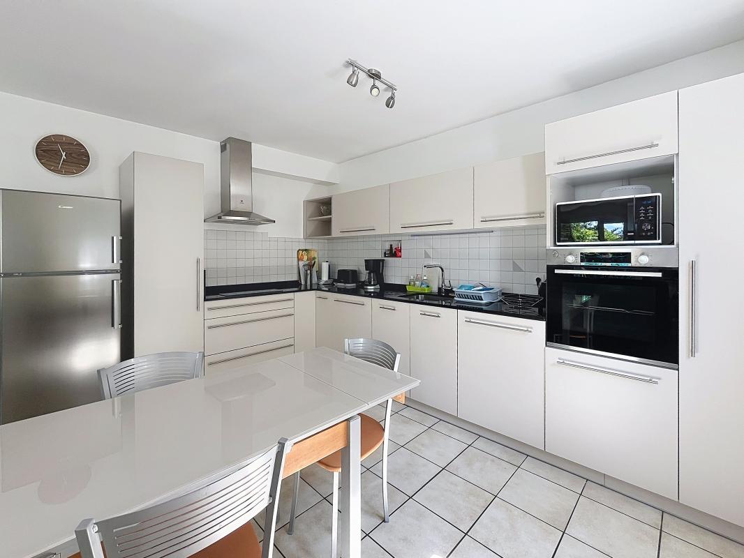 Le F3 au RDC de 118m² environ exposé SE/SO dispose d'un séjour double de 48m² avec cheminée donnant accès à une terrasse et balcons, 2 chambres dont une parentale, salle de bains, wc indépendant, cuisine ouverte aménagée et équipée, accès aux balcons et terrasse.
