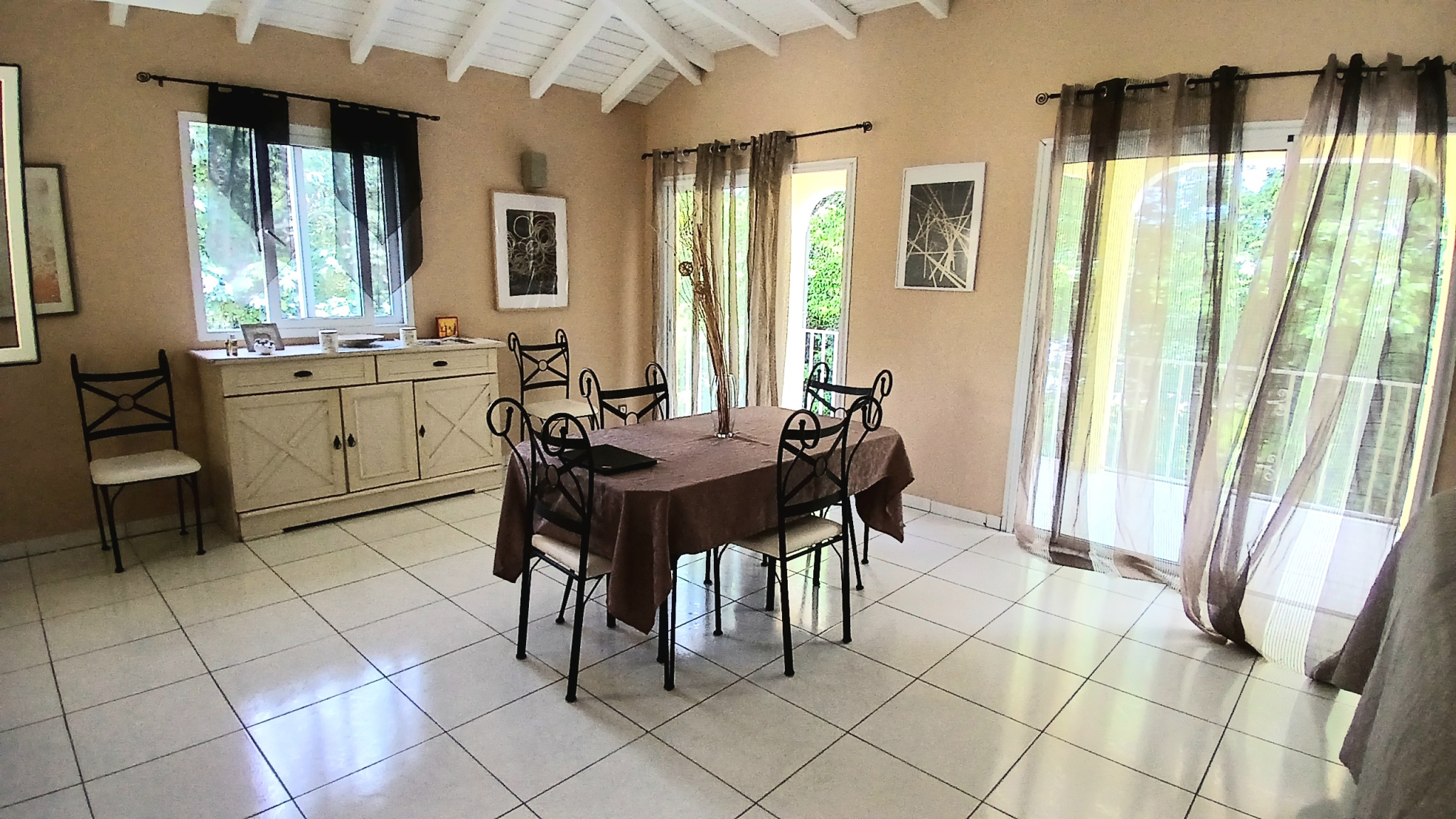 Rez-de-chaussée : Entrée principale très spacieuse : 30 m2, Double salon-séjour lumineux : 41 m2, Cuisine équipée : 28 m2, Suite avec chambre de 25 m2, salle d'eau, WC et douche à l'italienne. Étage (mezzanine accessible par l'entrée) : Grande suite parentale de 50 m2, avec Salle de bain attenante (double vasques, douche italienne, WC) et Terrasse privative. Niveau inférieur (accessible par escalier intérieur) : 2 Chambres (12m2 et 15m2), Salon-séjour : 23 m2 donnant sur une terrasse couverte de 15 m2, Cuisine extérieure neuve et équipée, Salle de bain avec douche italienne + WC, Toutes les pièces sont équipées de brasseurs d'air.