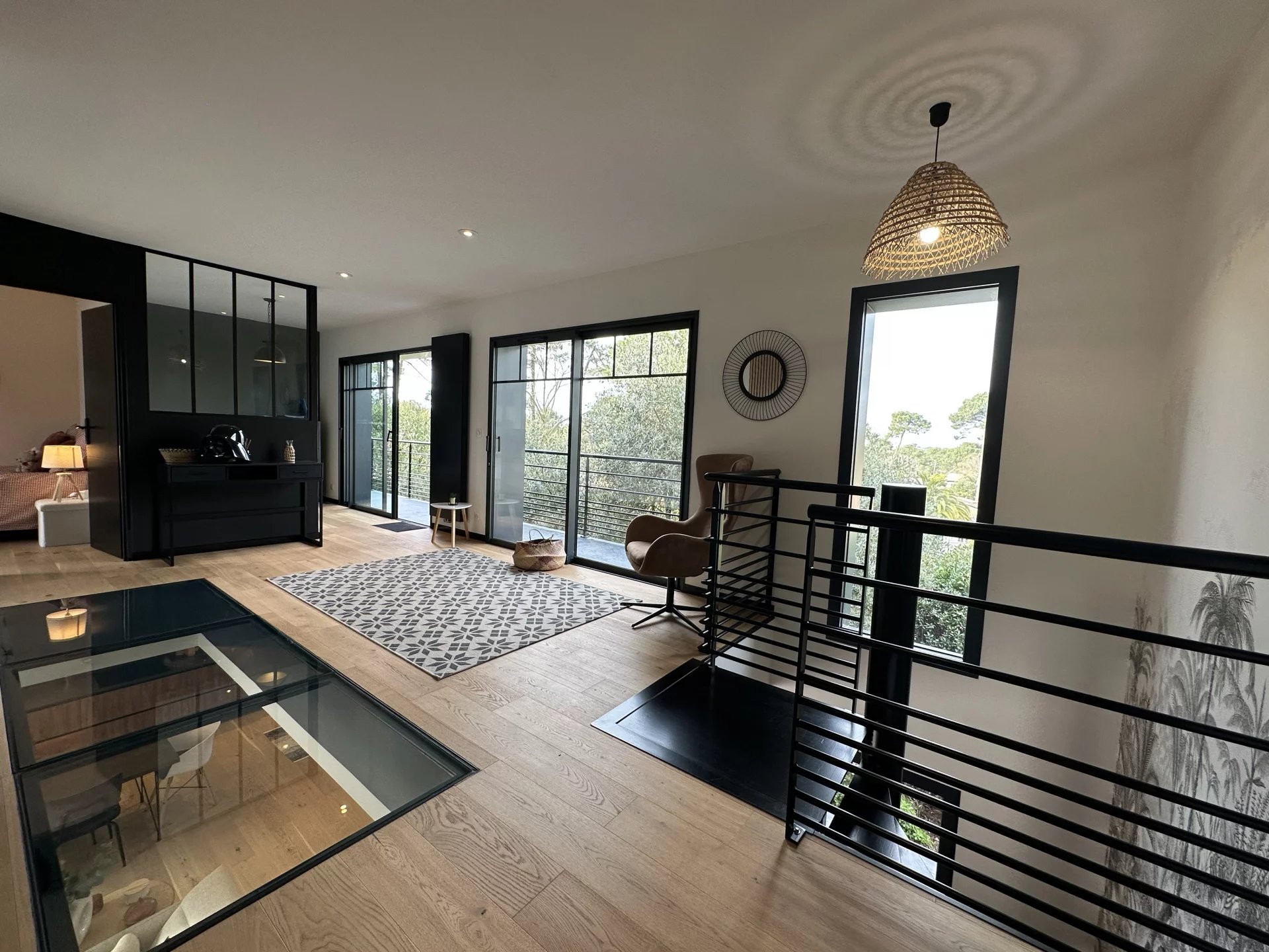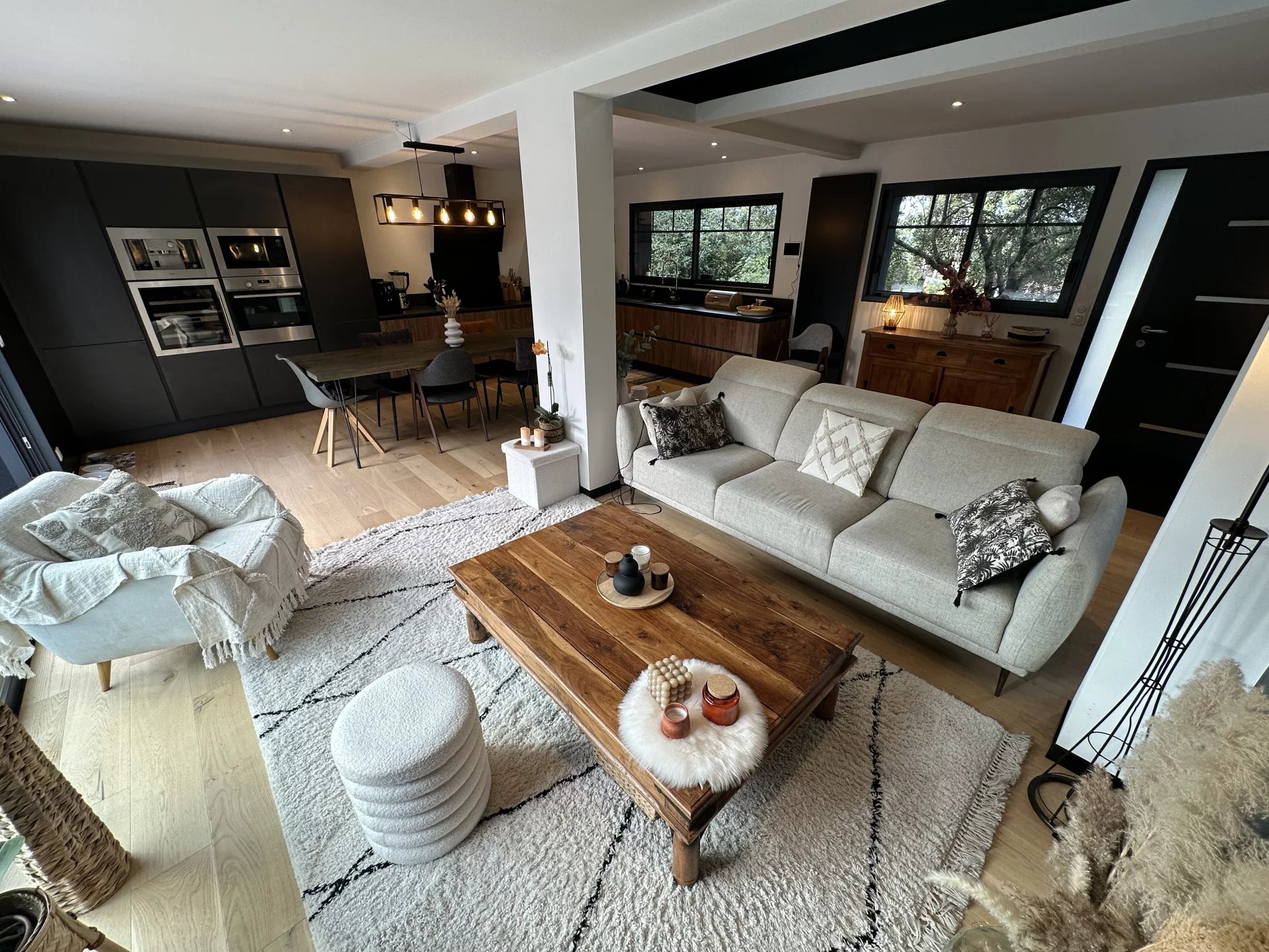 La pièce de vie spacieuse et lumineuse est sublimée par une immense baie vitrée à galandage.