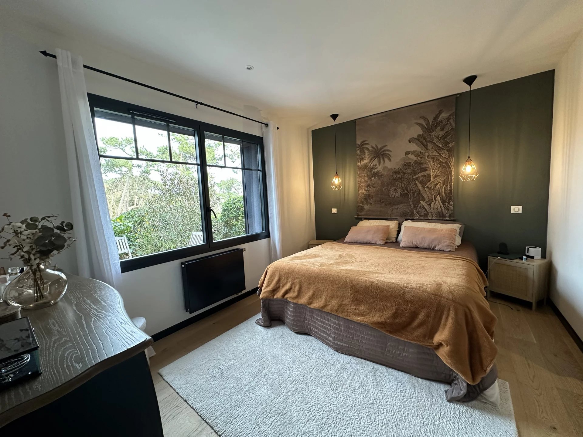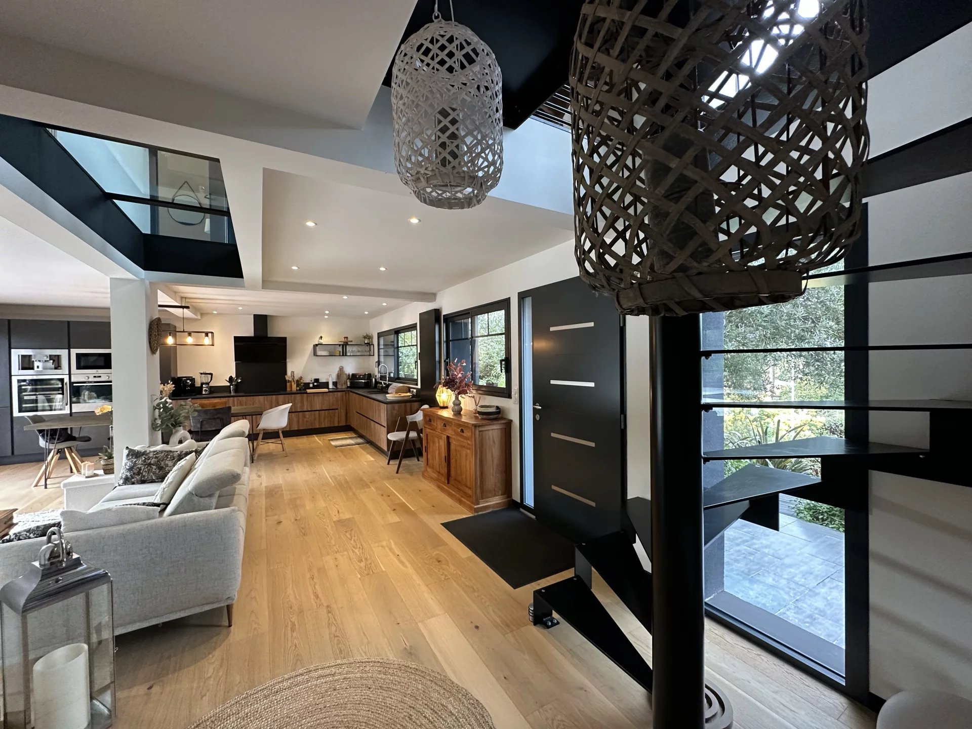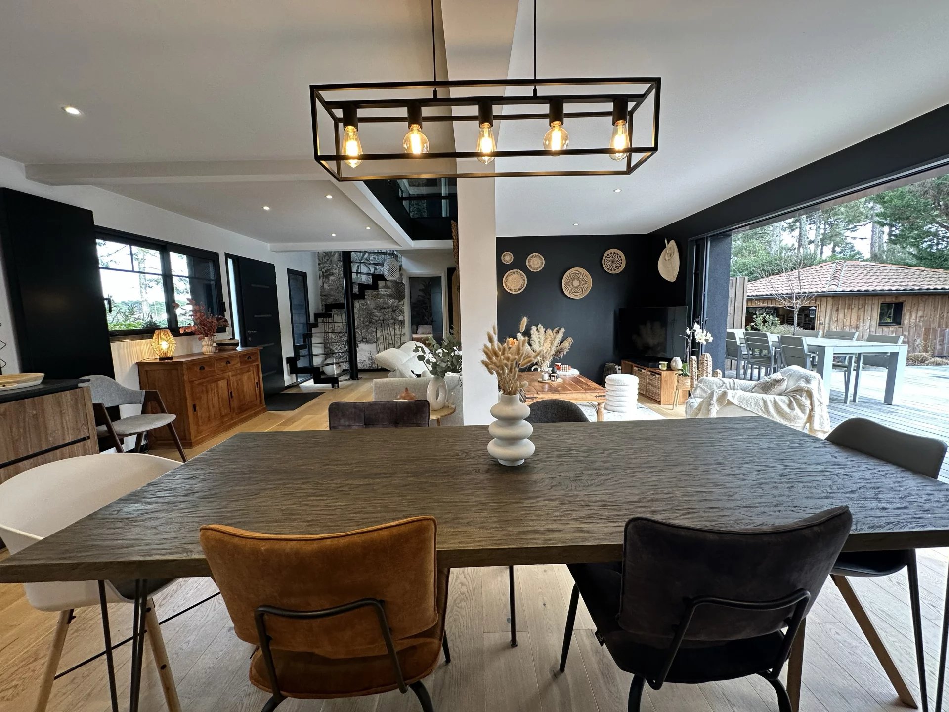 L'intérieur et l'extérieur se confondent, créant une harmonie parfaite avec la nature environnante. La terrasse, prolongement naturel de la pièce de vie, s'ouvre sur une piscine chauffée où se reflètent les majestueux pins, offrant un spectacle apaisant et enchanteur.