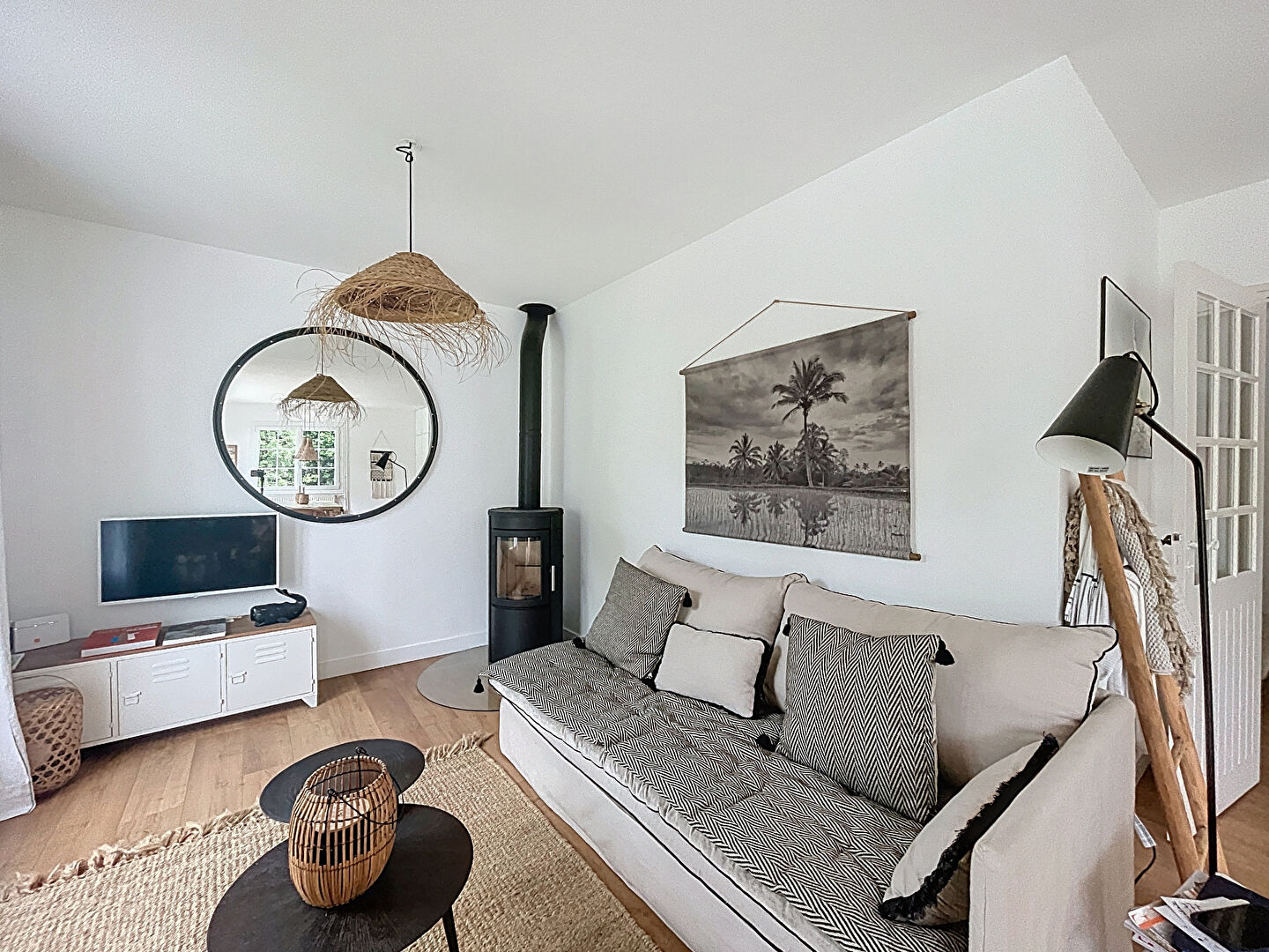 Salon cosy avec poêle à bois avec accès direct à une terrasse ensoleillée.