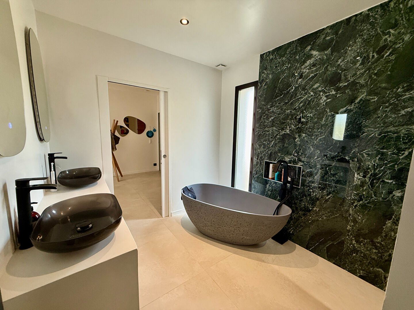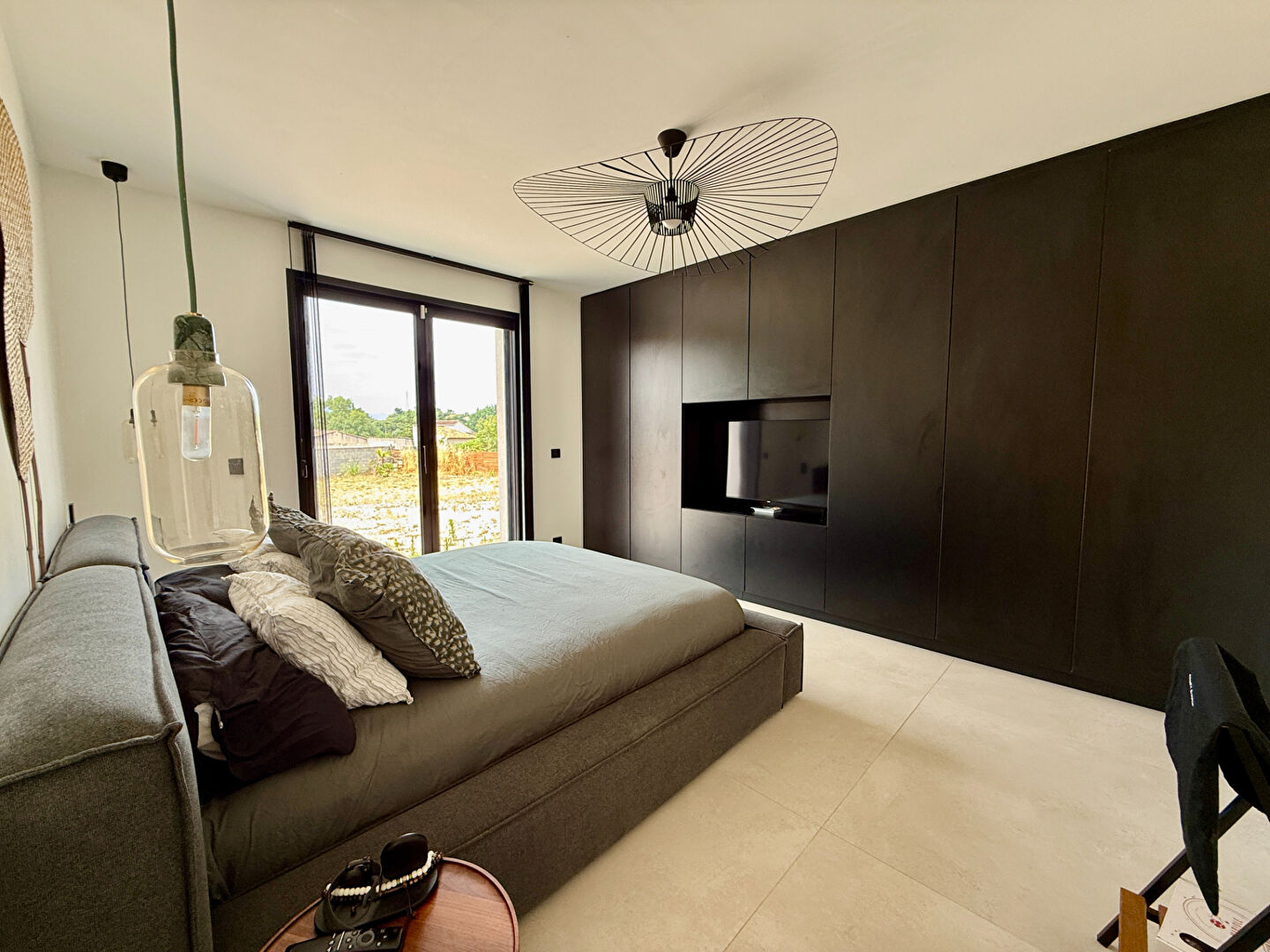 Au rez-de-chaussée, découvrez une grande suite parentale avec un dressing sur mesure. Vous y trouverez également une salle de bain moderne équipée d'une douche à l'italienne, d'une baignoire centrale et d'un WC japonais indépendant.