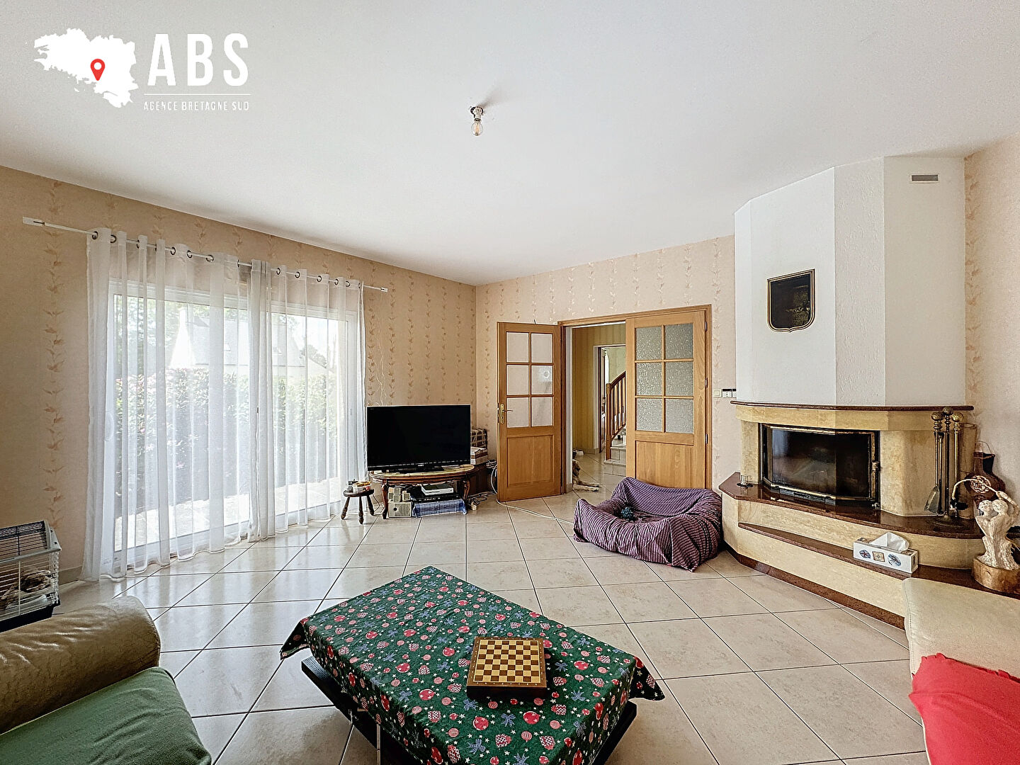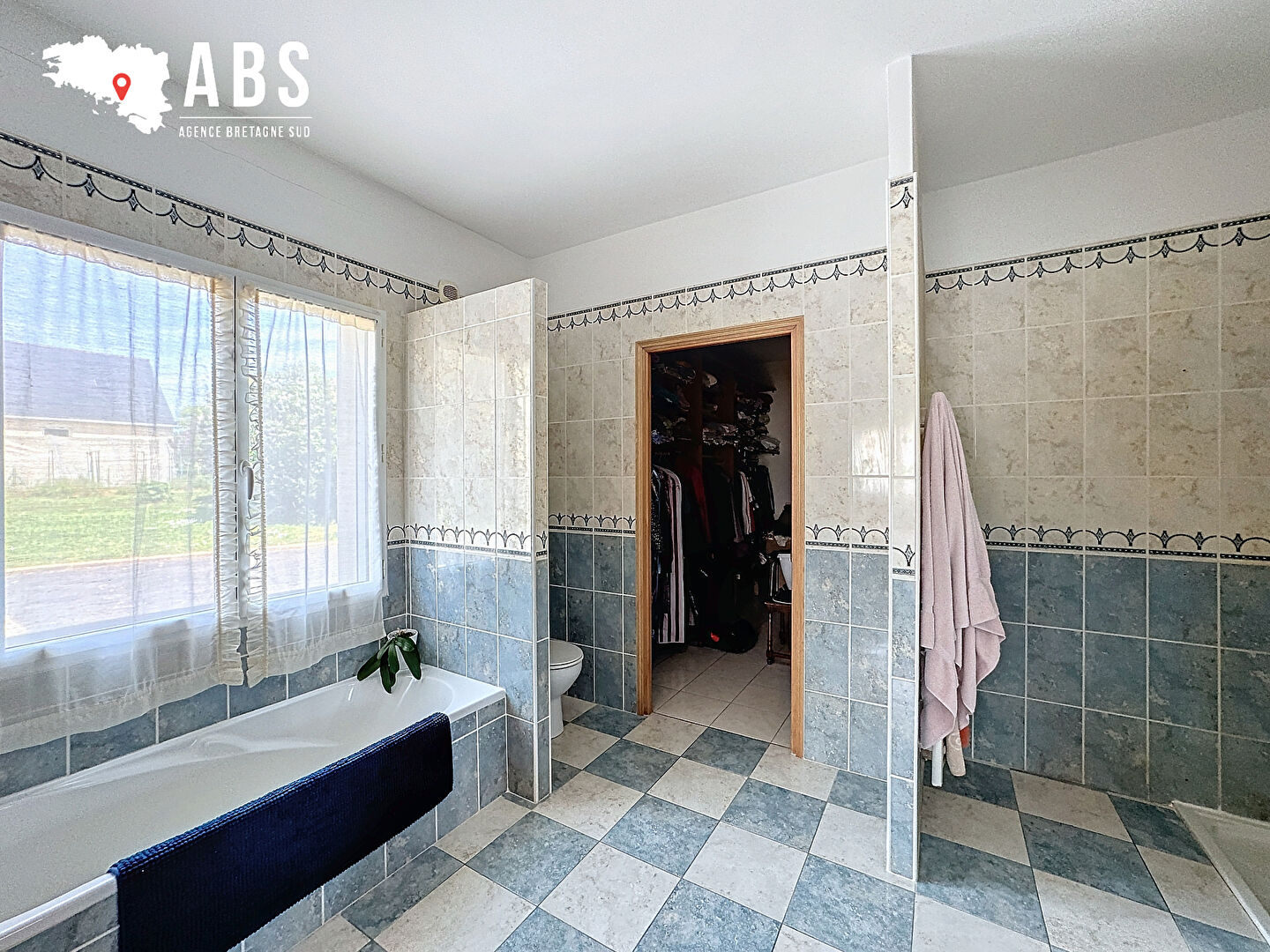 En rez-de-jardin : entrée avec placard, séjour/salon avec cheminée insert, de 44 m2, grande cuisine A/E, arrière cuisine avec placards, wc - vestiaire, bureau, chambre avec salle de bains pirvative (baignoire + douche) et dressing