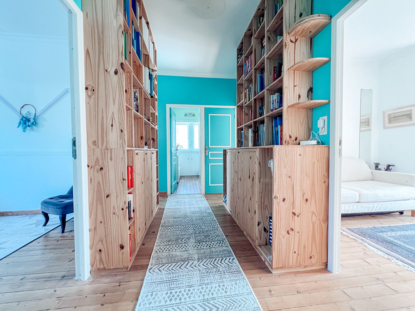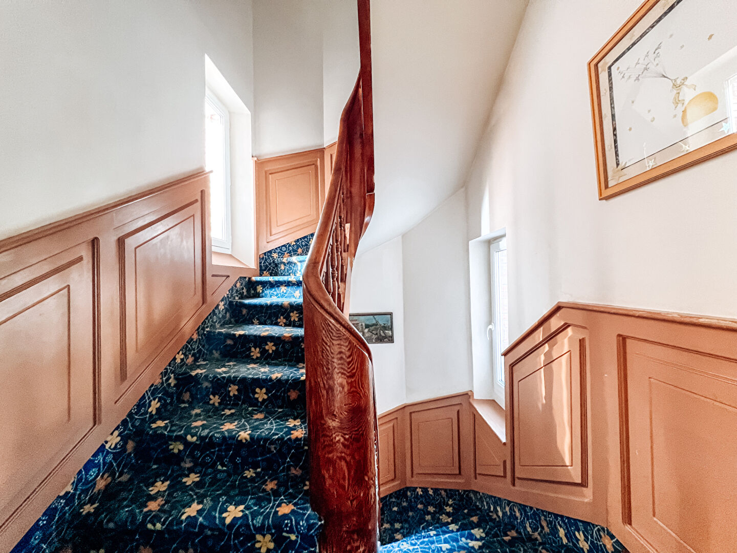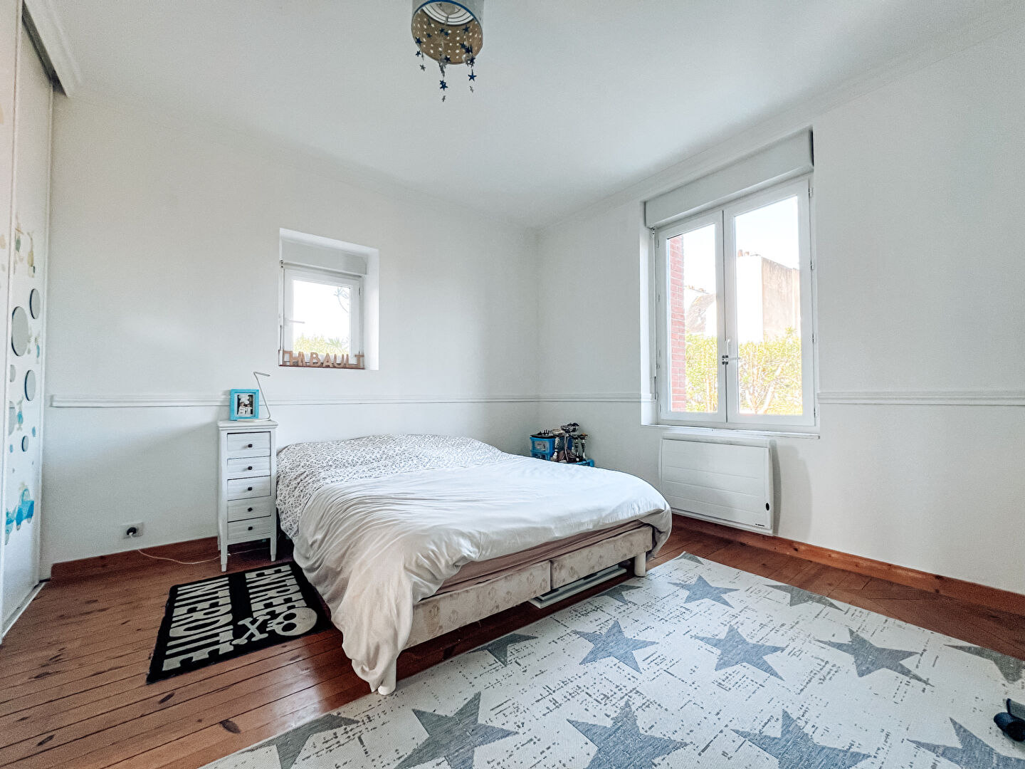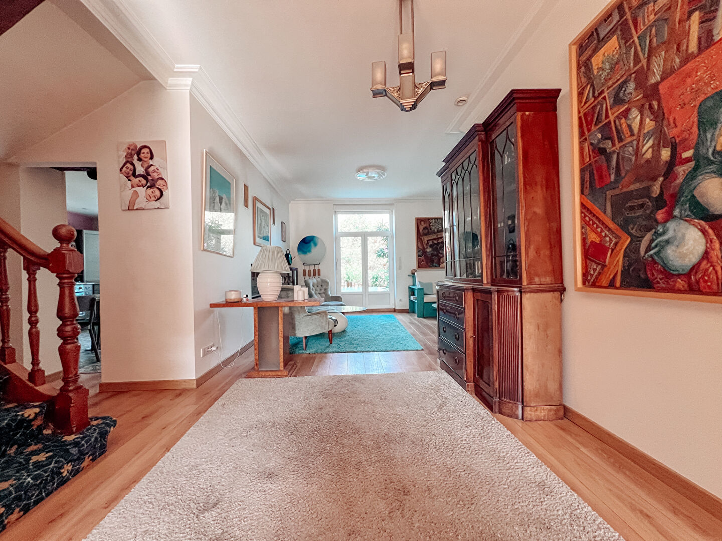 A l'étage : un palier avec de grandes bibliothèques, quatre chambres spacieuses et lumineuses avec placards, une salle d'eau avec double vasque, WC séparé.