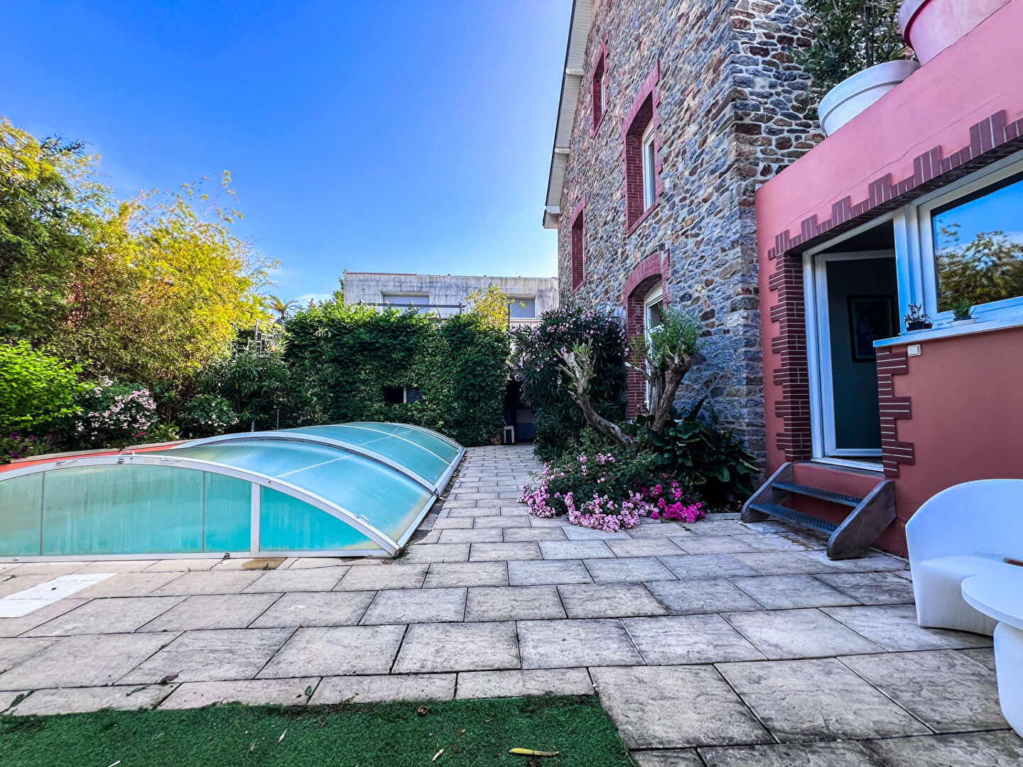 Une grande pièce supplémentaire est aménagée dans le jardin avec double douche retour de plage, WC, et salle de jeux insonorisée, ainsi que son rooftop. Aménagement possible en appartement indépendant.