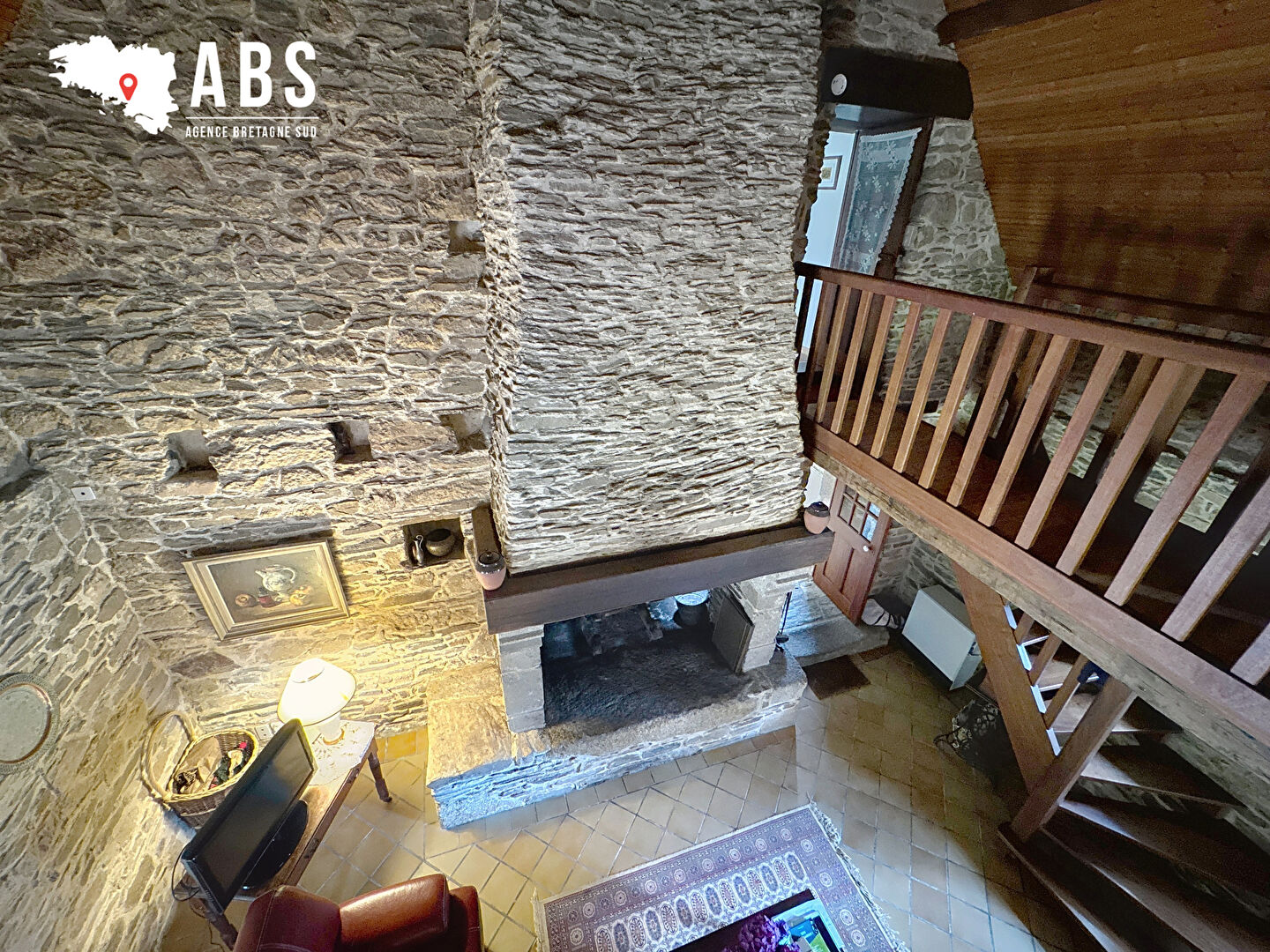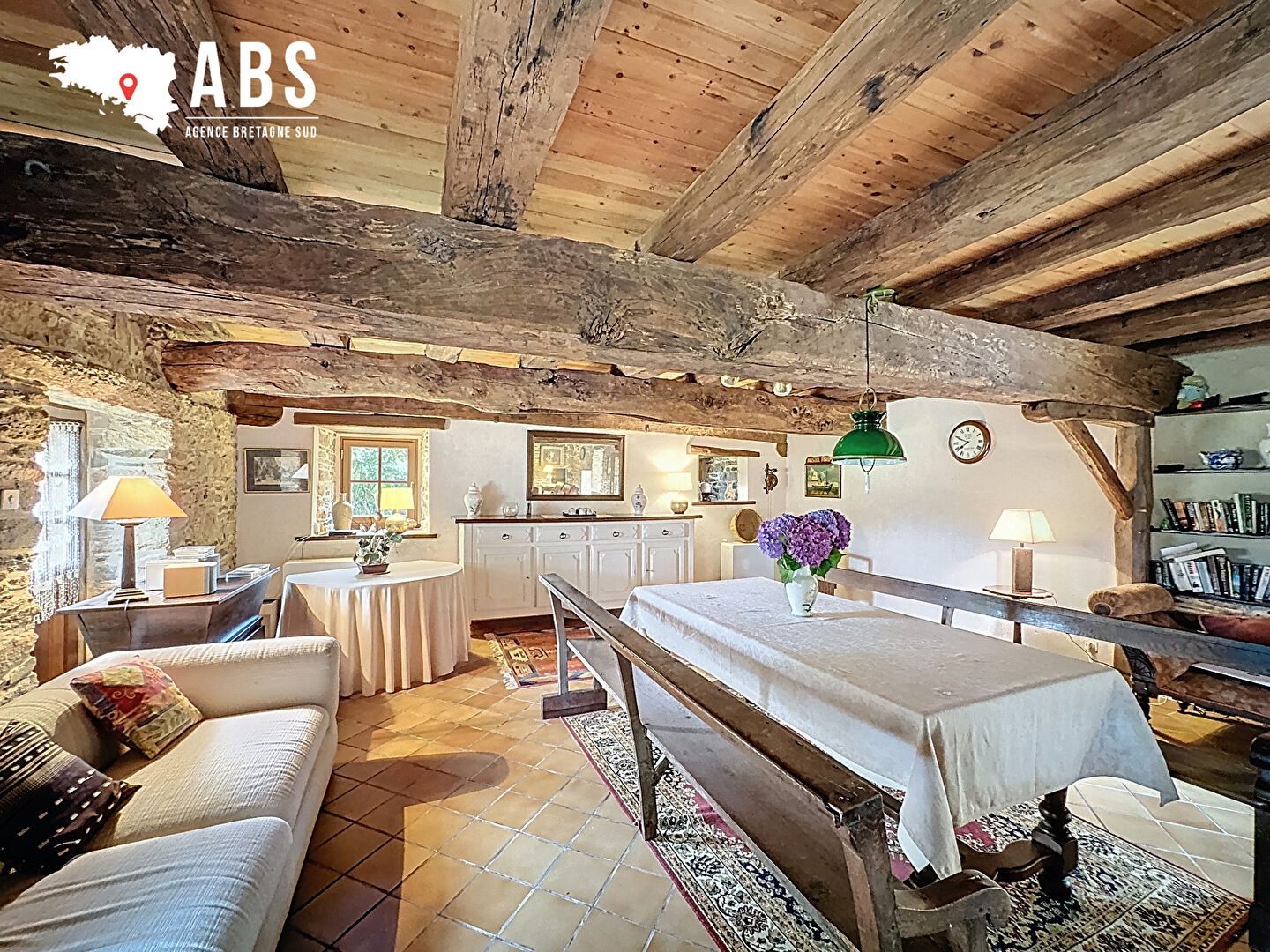 Entrée avec placard, wc, cuisine indépendante, , Séjour/Salon de 60 m2 avec cheminée (foyer ouvert), poutres apparentes, et murs pierres