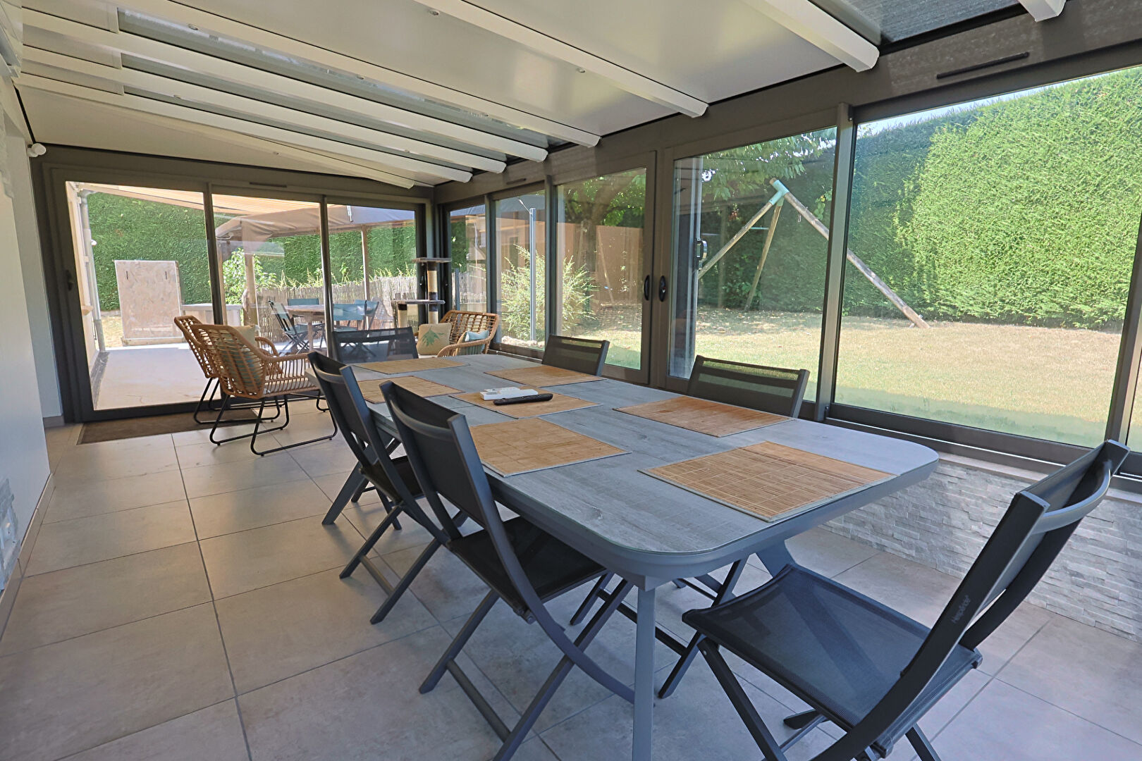 Belle pièce de vie ouverte et grande véranda pour profiter de la lumière toute l'année.