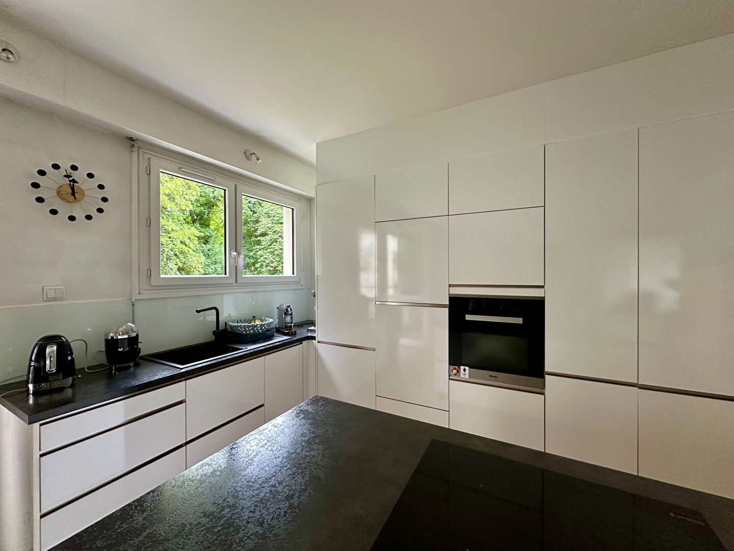 La cuisine ouverte élégante et conviviale se pare d'un ilot central généreux parfait pour les repas partagés et les éclats de rire