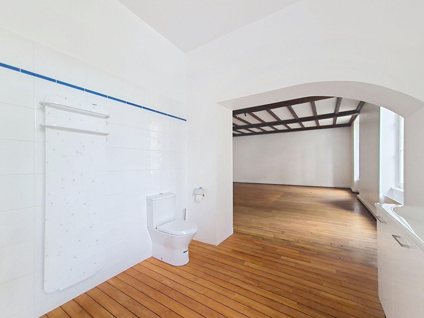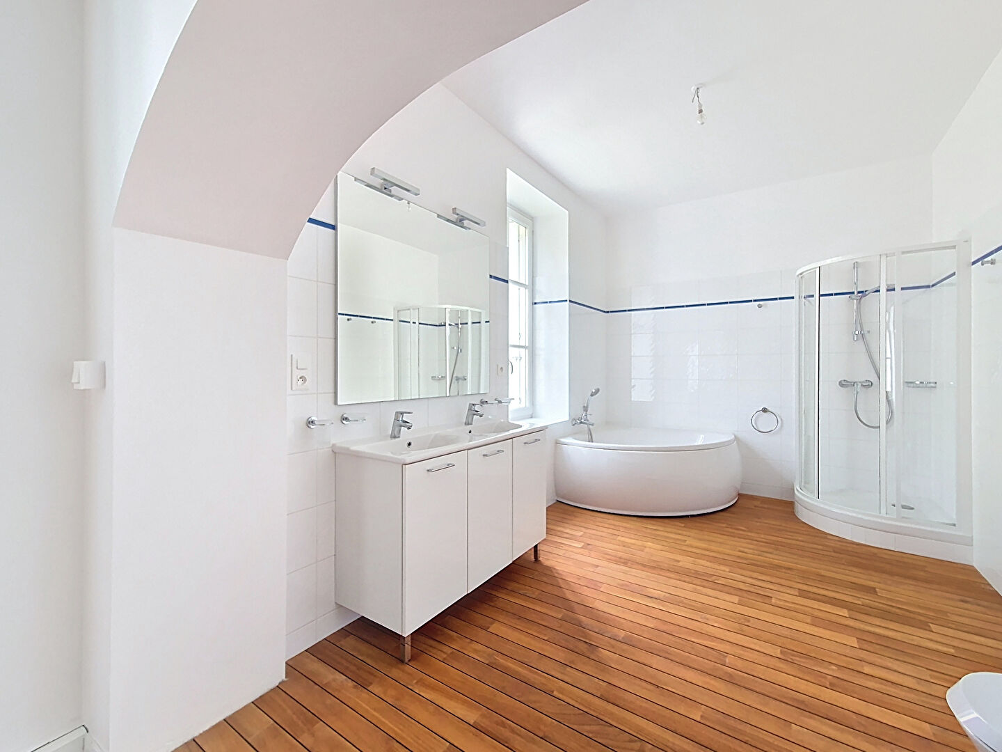 - au 1er étage : palier, une très grande chambre avec parquet et poutres bois ouverte sur une salle de bains et douche et deux vasques, une salle d'eau avec WC