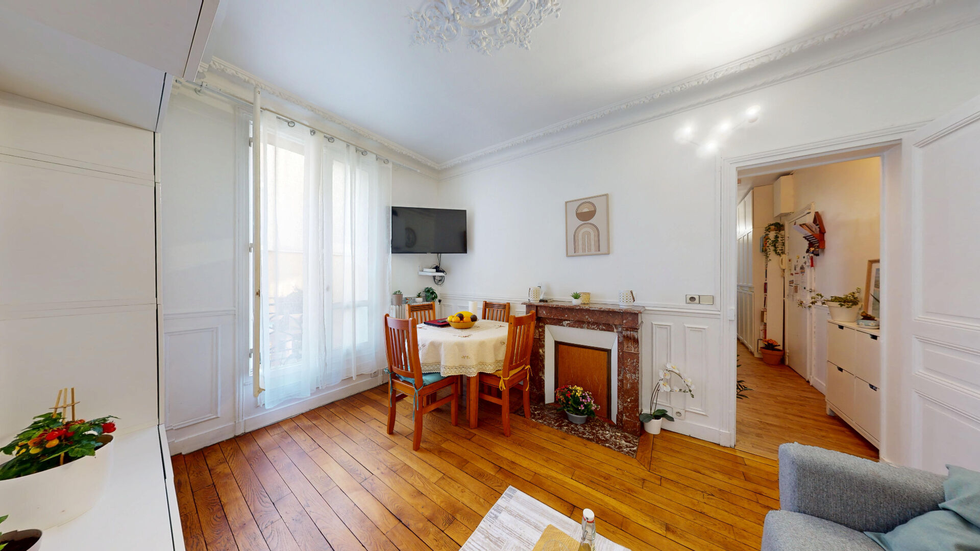 - Beau Séjour d'environ au charme fou, avec parquet massif, boiseries murales, moulures, cheminée en marbre, grande fenêtre en bois double vitrage : un espace chaleureux et lumineux pour les instants partagés.