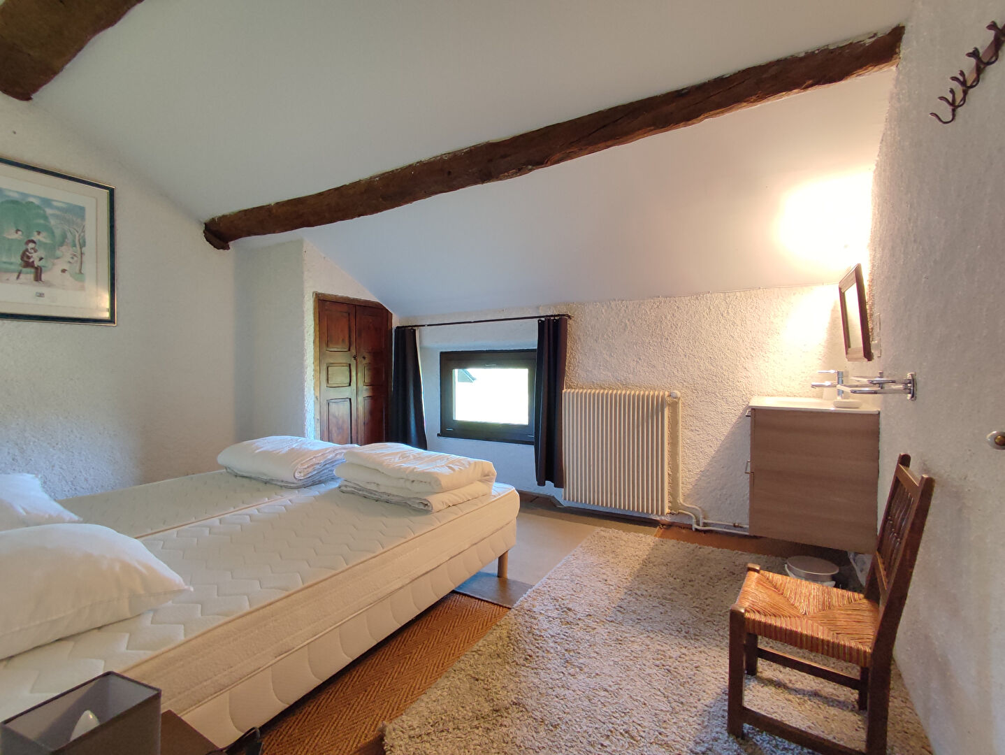 - Rez-de-chaussée : Grand séjour cathédrale avec cheminée insert, Cuisine séparée, entièrement équipée, WC indépendant, Garage/atelier