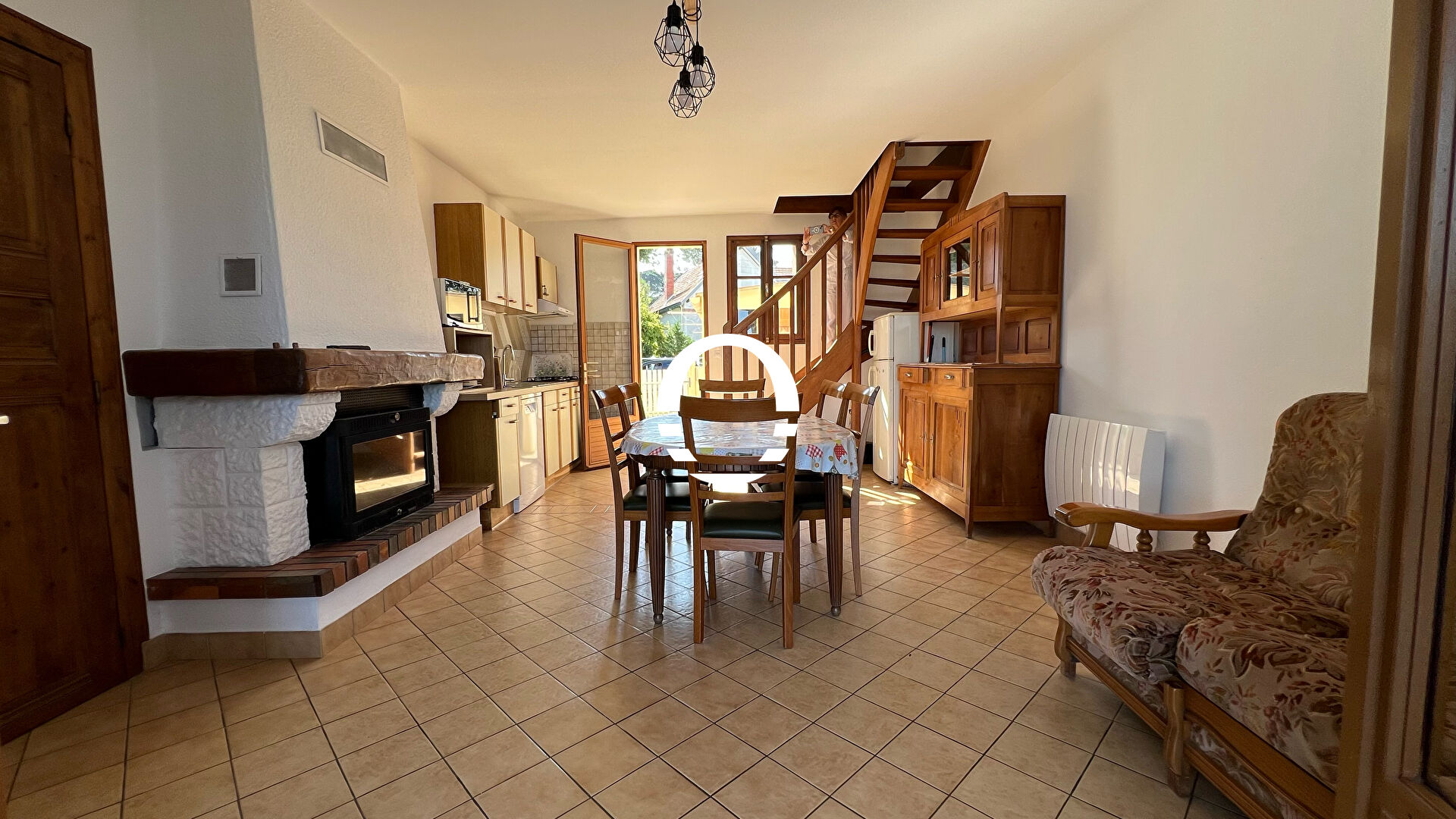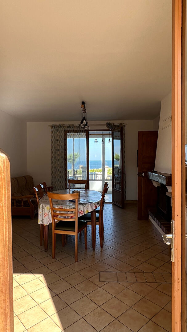 Cette maison se compose en rez-de-chaussée d'une entrée salon séjour avec cusine ouvertz et cheminée à insert, une véranda avec vue panoramique sur l'océan, une salle d'eau et un WC.