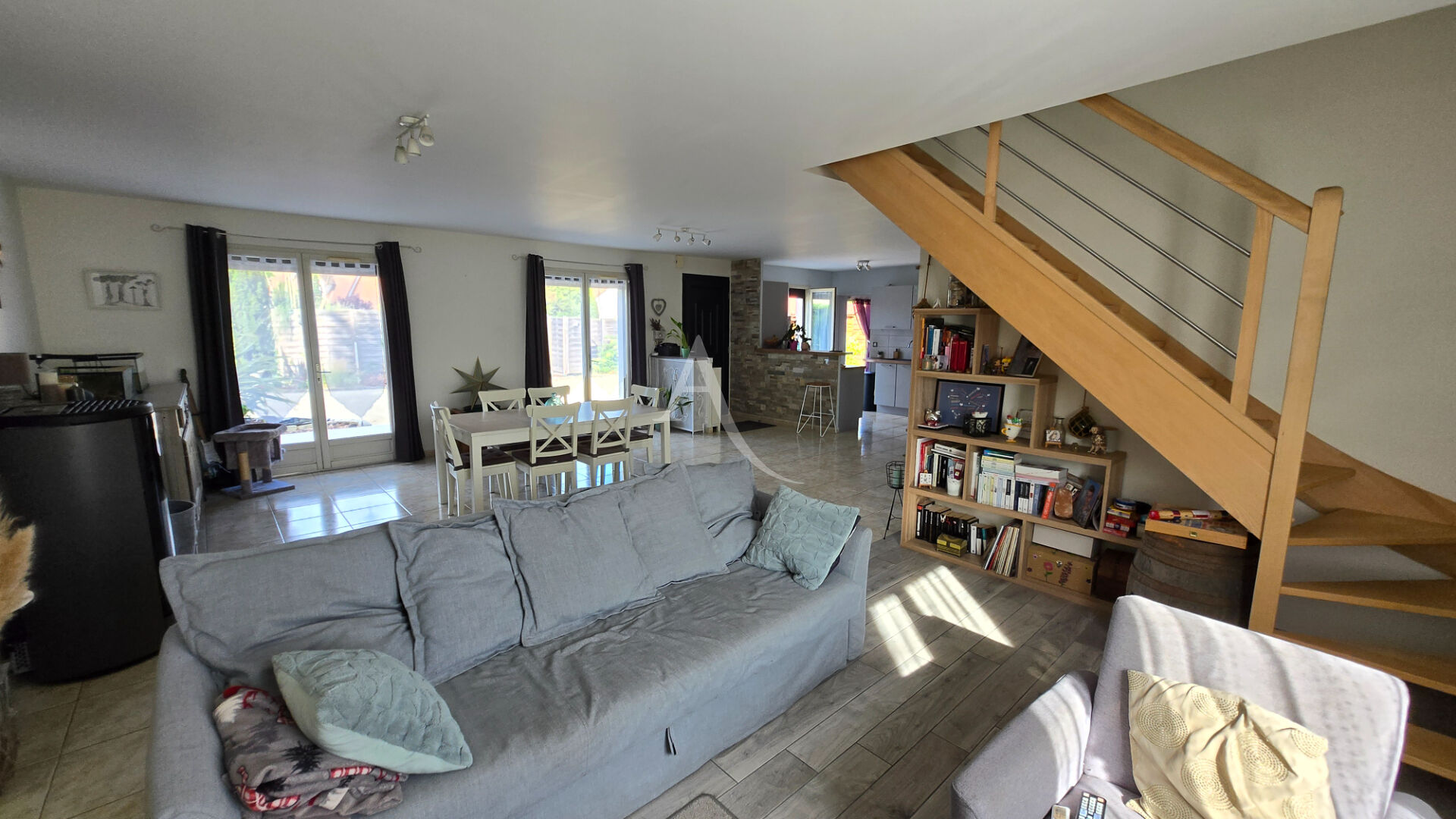 En entrant vous découvrez une belle pièce de vie traversante et baignée de lumière, avec son poêle à granulés, une cuisine aménagée et entièrement équipée.