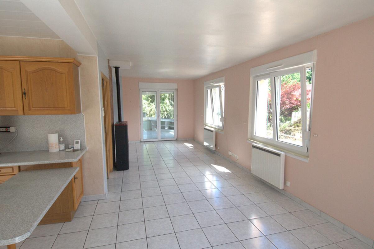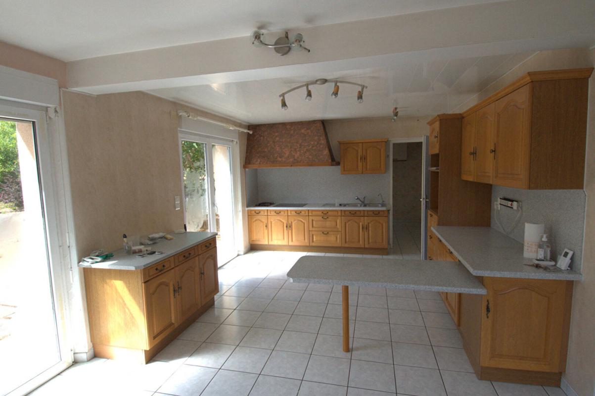 Le salon-séjour, chaleureux et convivial, est ouvert sur une cuisine, créant un bel espace de vie.