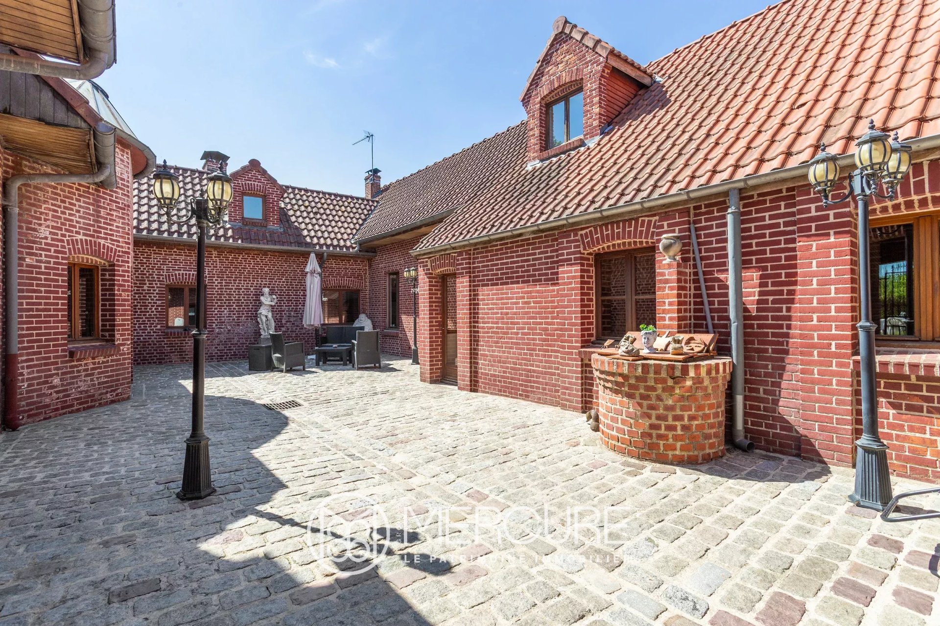 Située au cœur de la Flandre intérieure, à 30 km de Lille, sur une parcelle arborée de 2300 m², cette ancienne ferme au carré, entièrement rénovée, offre 17 pièces à vivre pour une surface totale de 390 m².