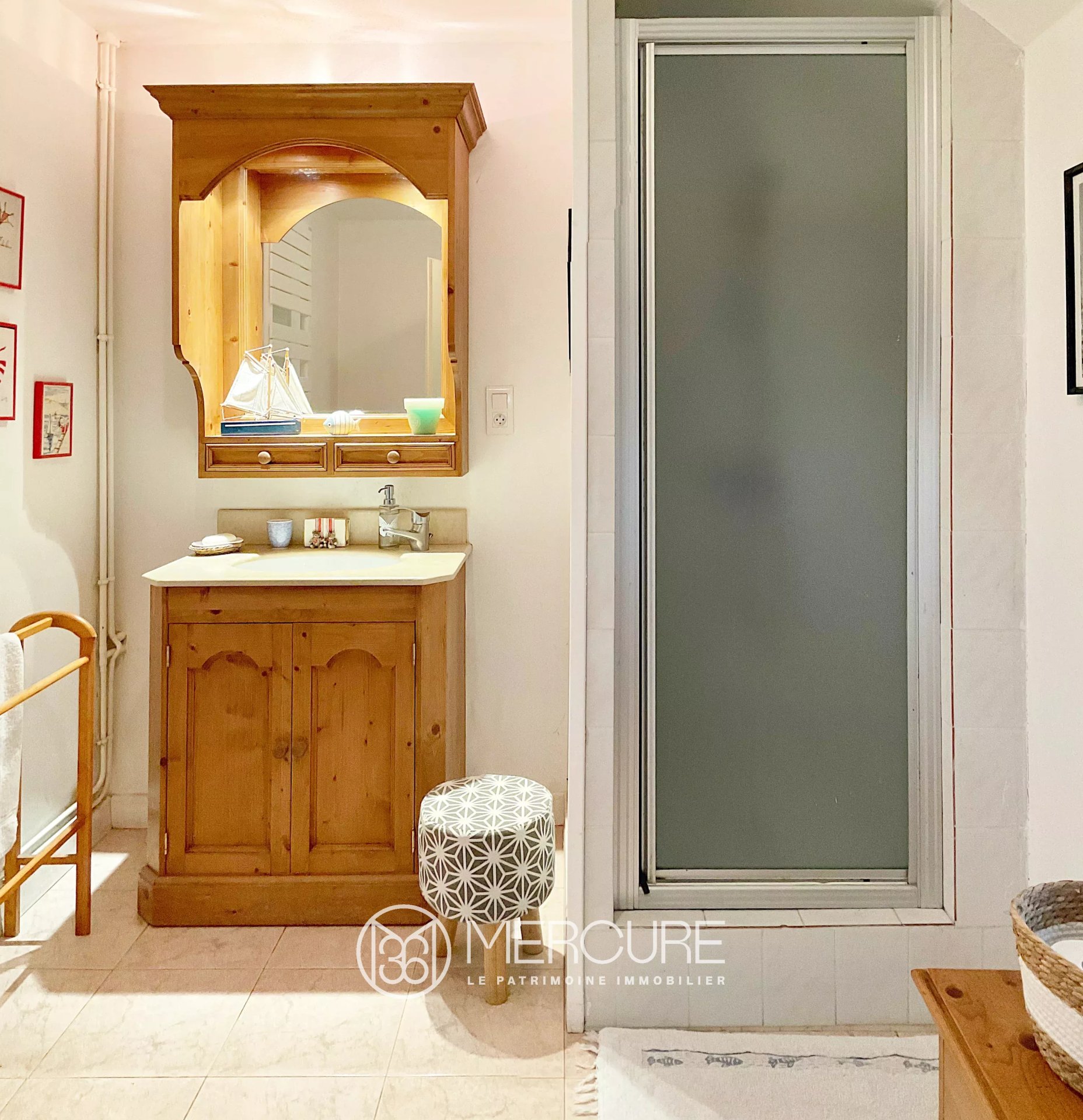 Une salle d'eau avec des toilettes et une salle de bain au joli plancher "bateau" complètent ce niveau.