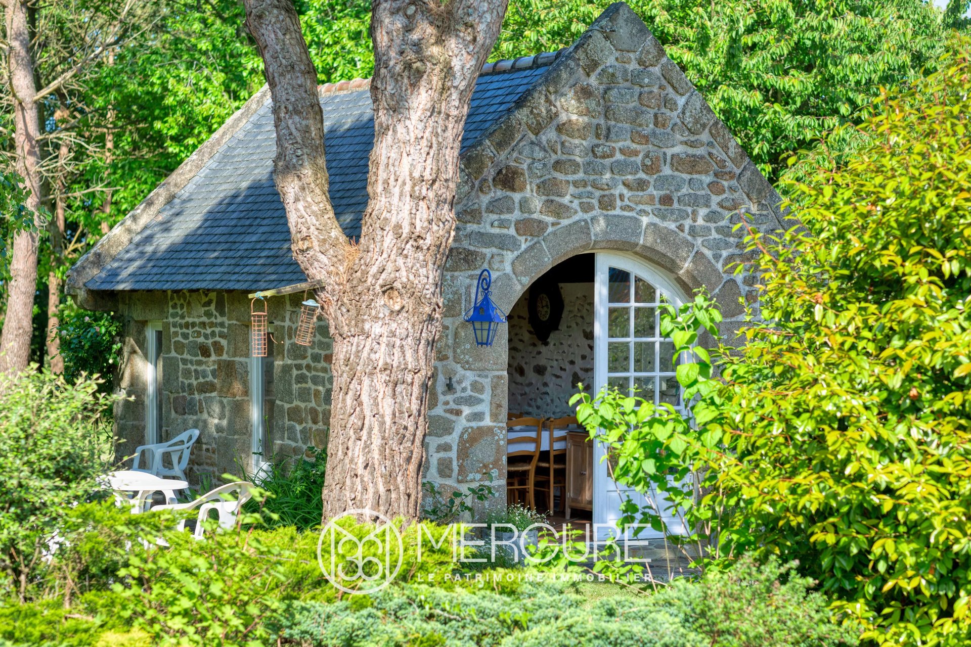 Le jardin est fleuri (hortensias, rhododendrons, azalée, rosiers) avec des allées gravillonnées. Mur d’enceinte en pierre réhaussée d’une grille en fer forgée.