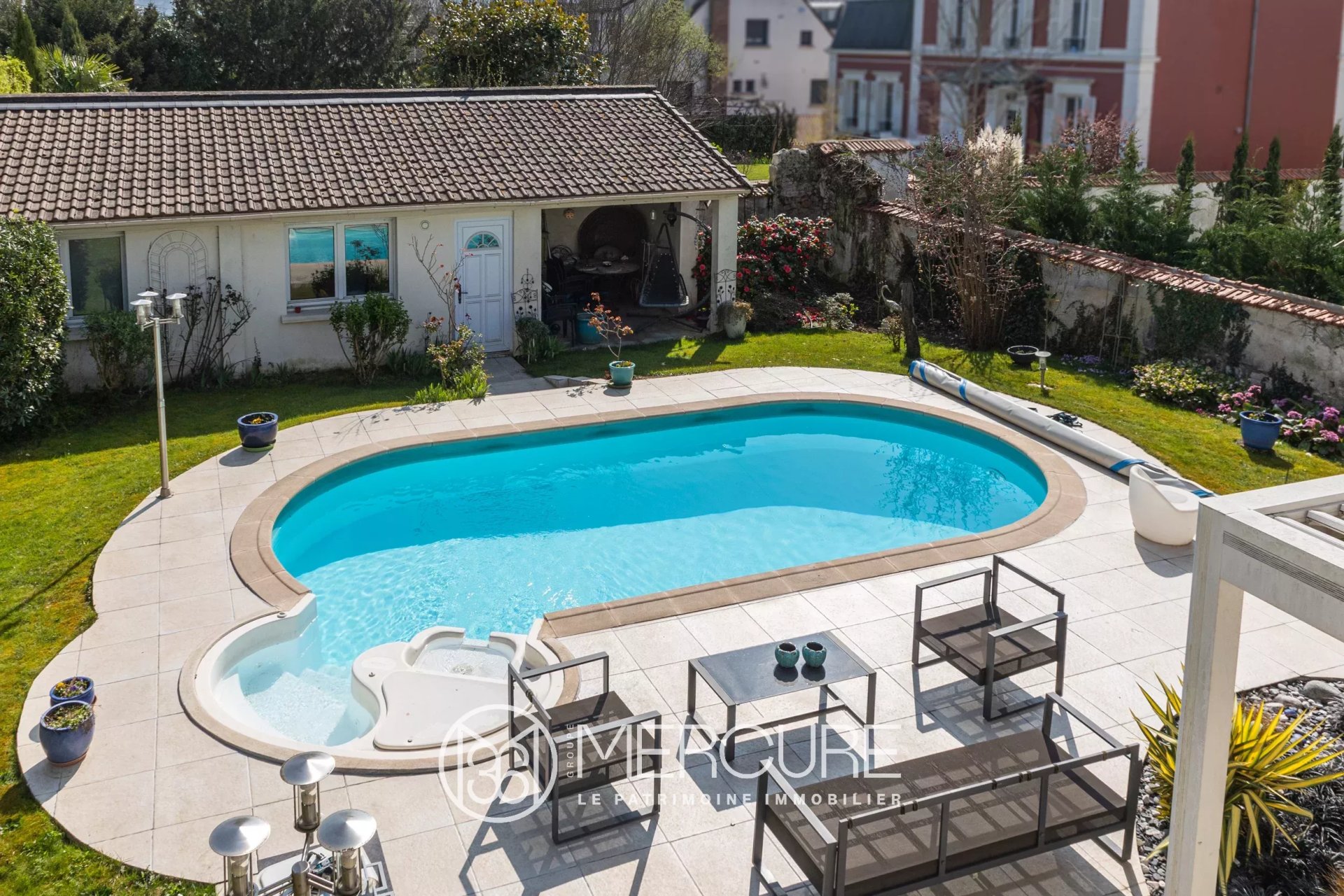 La propriété est agrémentée d'une piscine extérieure chauffée, entourée d'un jardin bien entretenu et clos de murs.