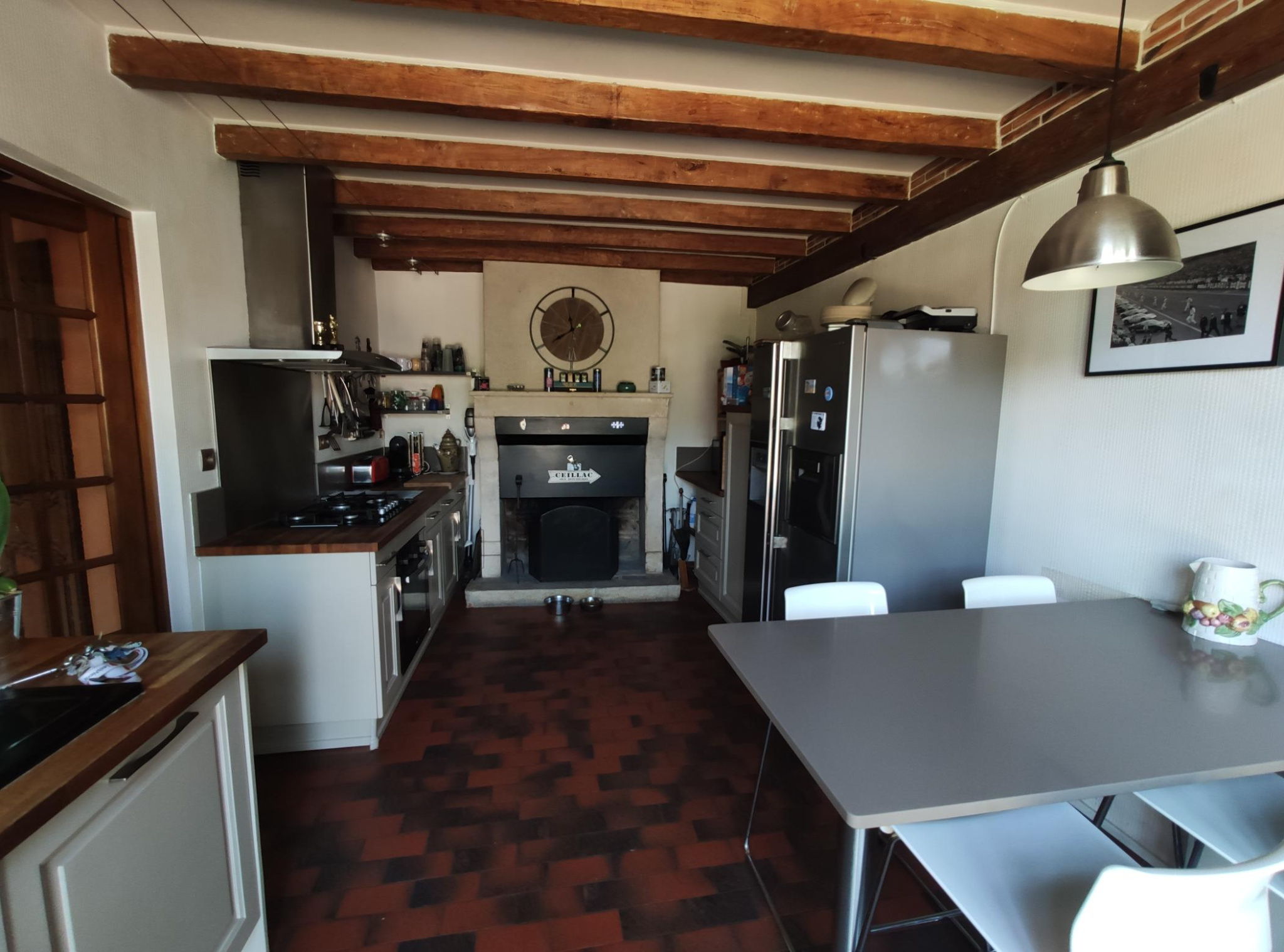 Au rez de chaussée : hall d'entrée avec rangements, cuisine meublée et équipée, spacieux séjour avec cheminée, une salle de bains, un wc, une grande chambre et une salle d'eau.