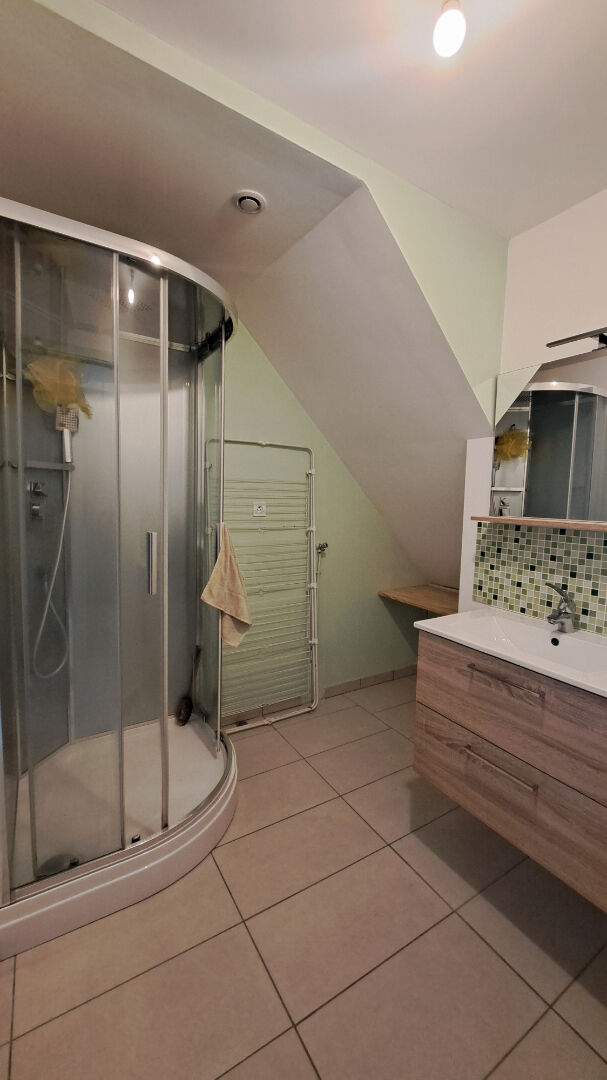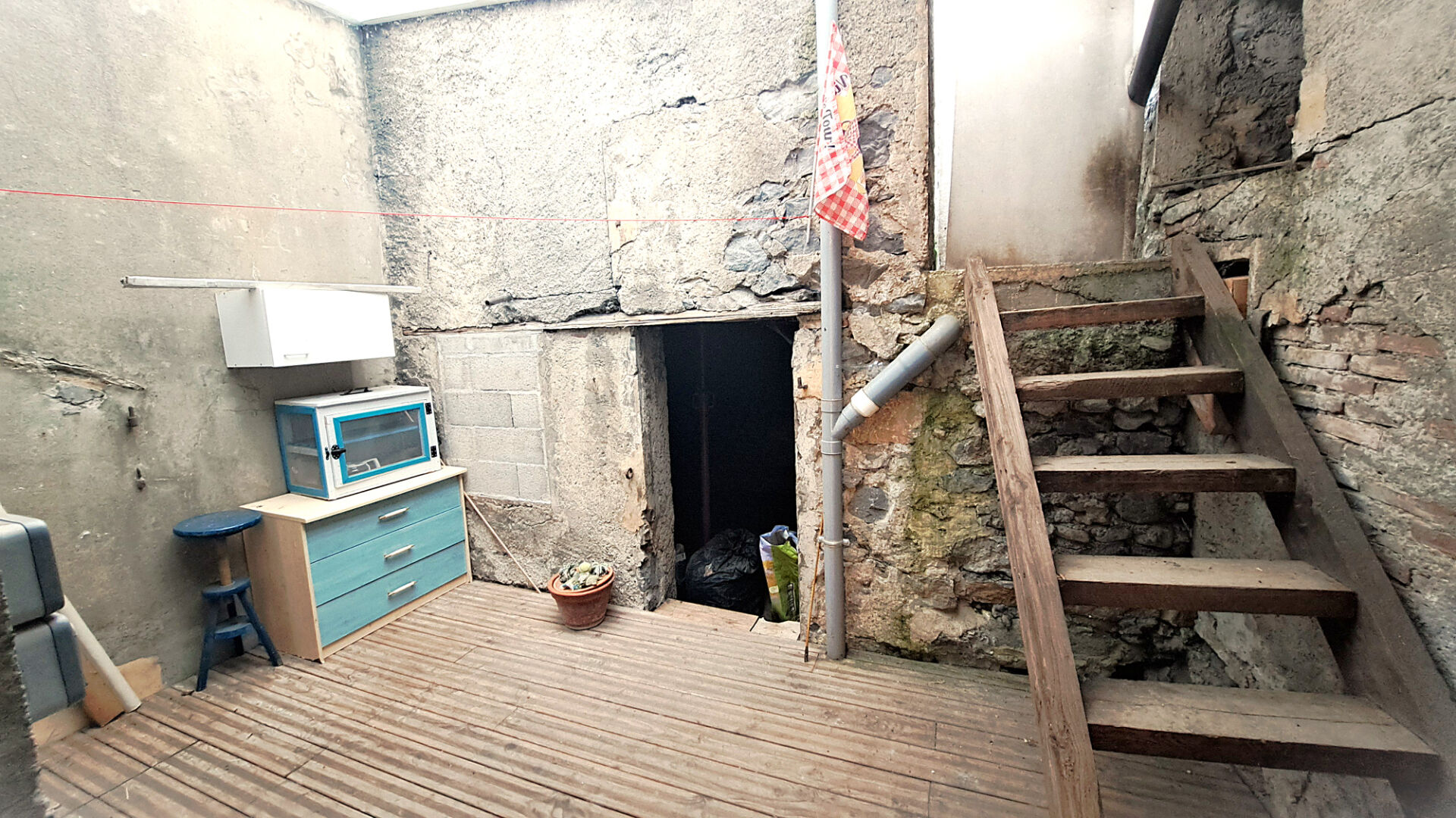 Le premier étage abrite un appartement de 42 m² (DPE : D et GES : B). Il comprend une pièce de vie avec cuisine ouverte, une chambre, une salle d'eau avec douche, un WC séparé et un cellier avec ballon d'ECS. Une courette et un débarras couverts complètent ce logement. Voir photos.