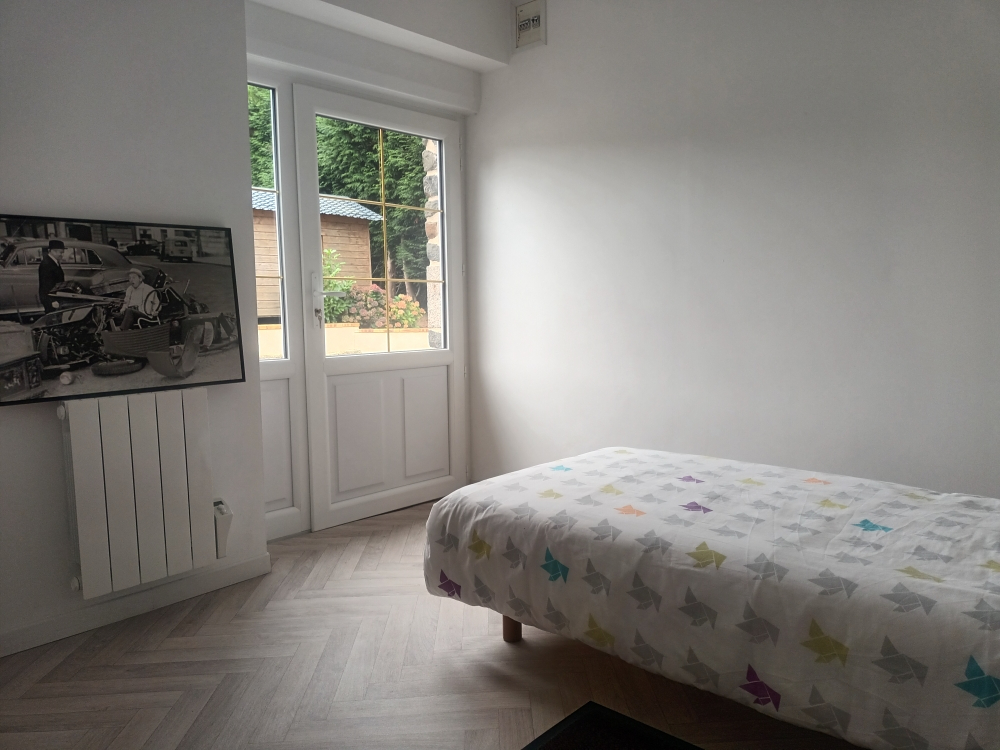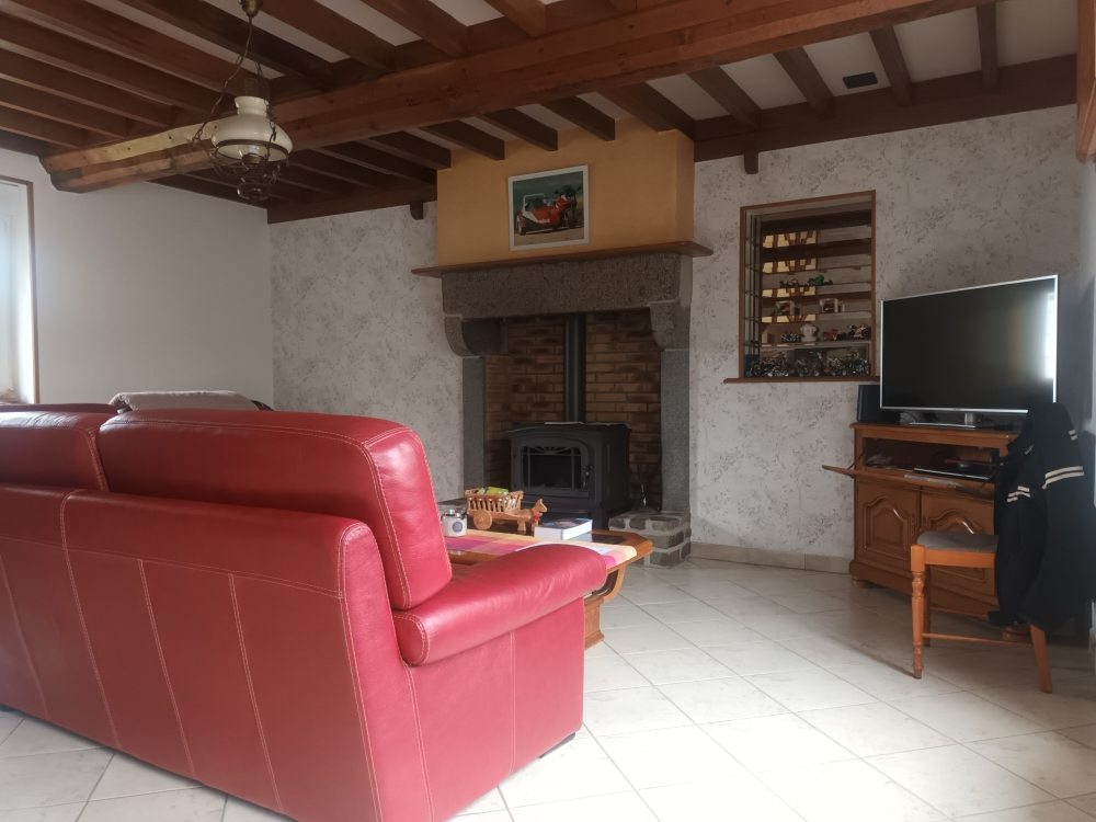 - au rez-de-chaussée : cuisine aménagée et équipée ouverte sur séjour-salon avec poêle à bois, une chambre, une salle d'eau et wc séparés.