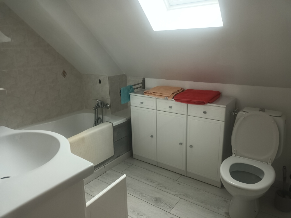 - à l'étage: dégagement desservant un bureau et deux chambres, une salle de bains avec wc.
