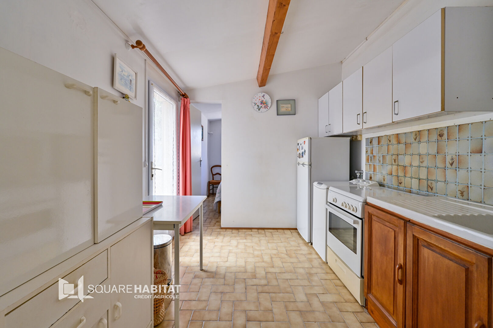 Séjour Salle à manger, cuisine aménagée, 2 pièces de 7 m² et 8 m², faisant office de chambre, douche, wc, cabinet de toilette. Le tout à rénover.