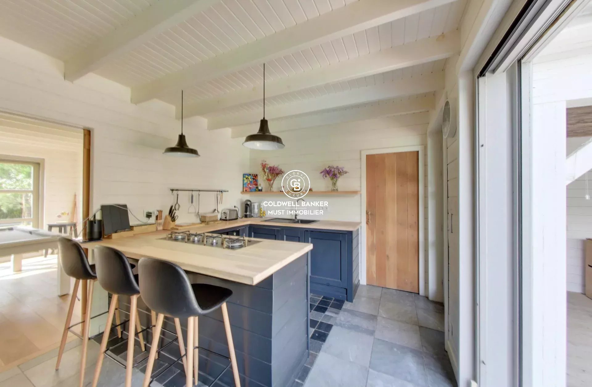 Le rez-de-chaussée se compose d’une cuisine équipée avec arrière-cuisine, d’un vaste séjour ouvrant sur la terrasse et la piscine, ainsi que d’une chambre avec salle d’eau et d’un WC indépendant.