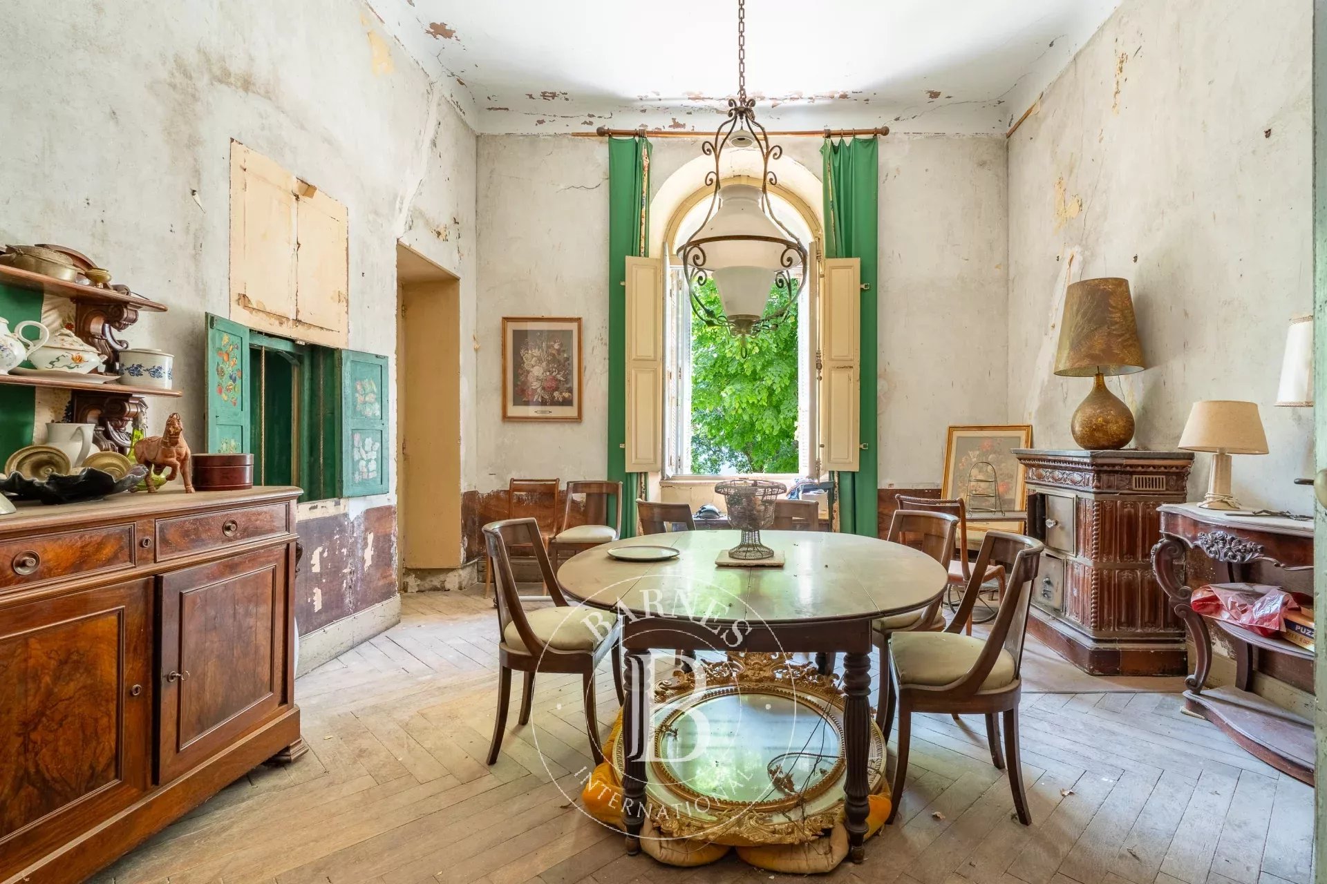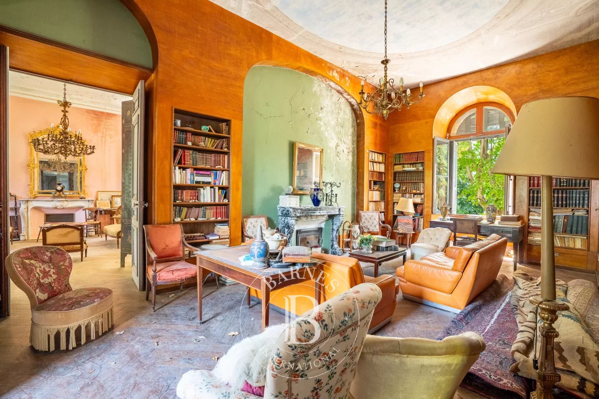 Réparti sur trois niveaux, il comprend un grand salon, une bibliothèque en boiserie, une petite et une grande salle à manger. Au sous-sol, une cuisine avec cheminée, un cellier, une buanderie ainsi que des caves complètent les espaces de vie. Les combles sont aménageables.