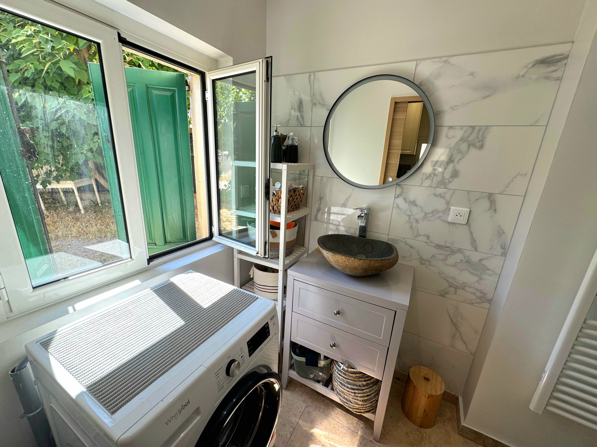 Une agréable véranda, idéale pour l'hiver, qui peut faire office de coin salon, d'espace détente ou d'activité complémentaire selon les envies. La cuisine est moderne et fonctionnelle, la chambre prolongé d'un espace dressing confortable, et l'ensemble forme un cocon parfaitement adapté à une personne seule ou un couple.