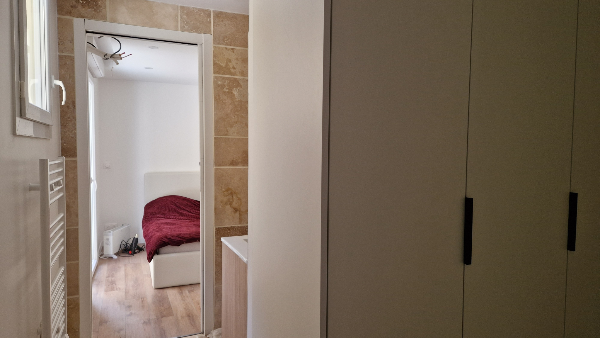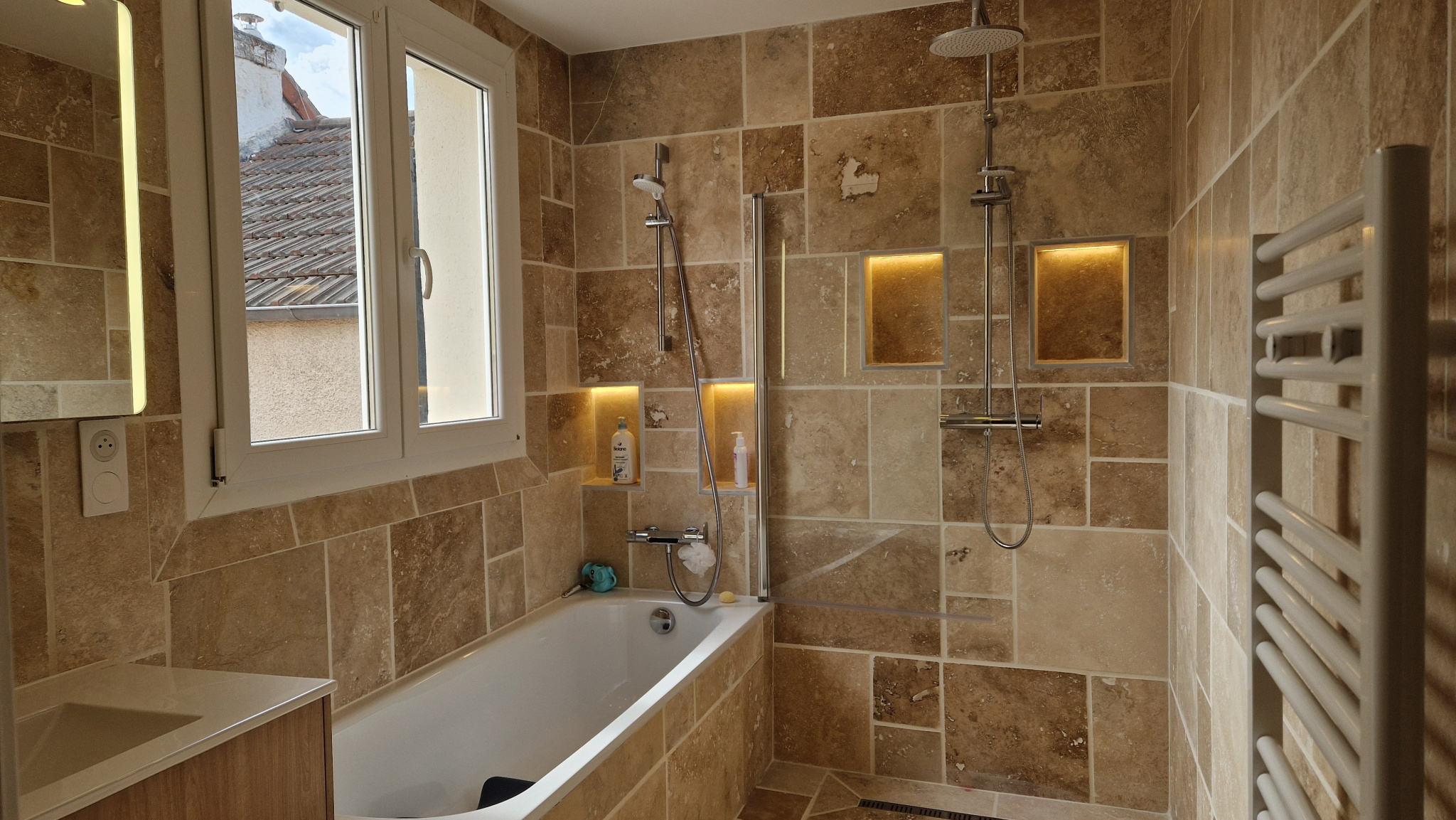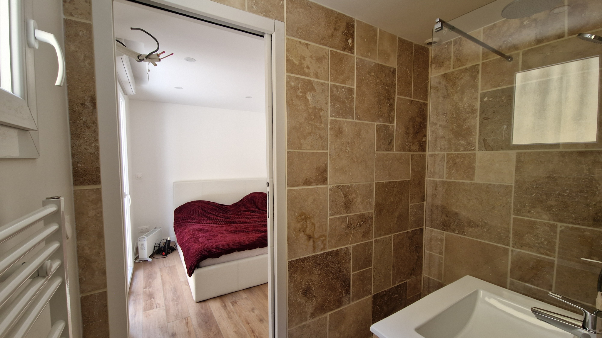 - à l'étage : un palier déservant 3 chambres dont une suite parentale avec salle d'eau, salle de bains avec baignoire + douche à l'italienne tout en pierre, un WC suspendu.