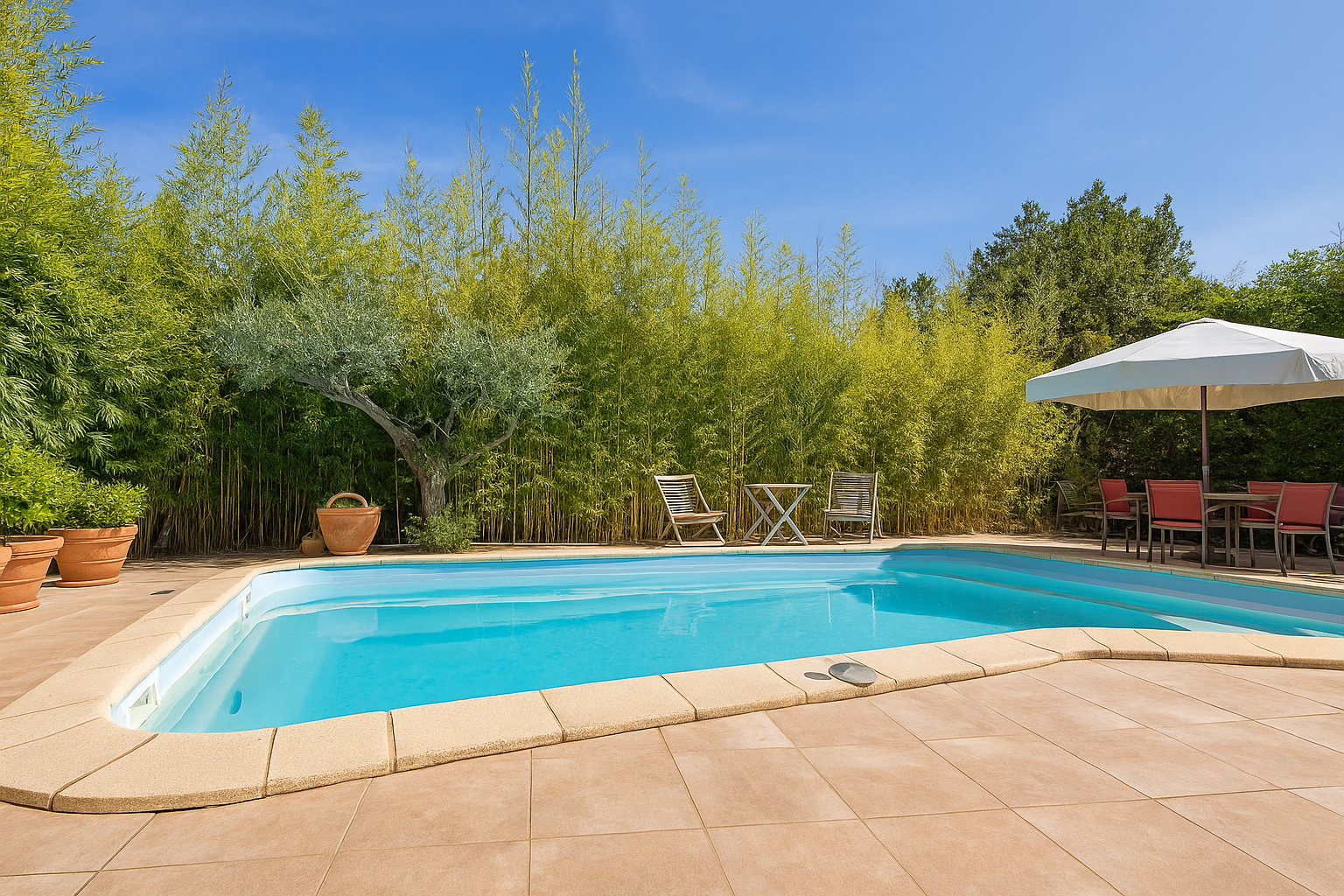 Une vraie pièce de réception ouvrant par de larges biaes vitrées sur la terrasse ombragées et la piscine,