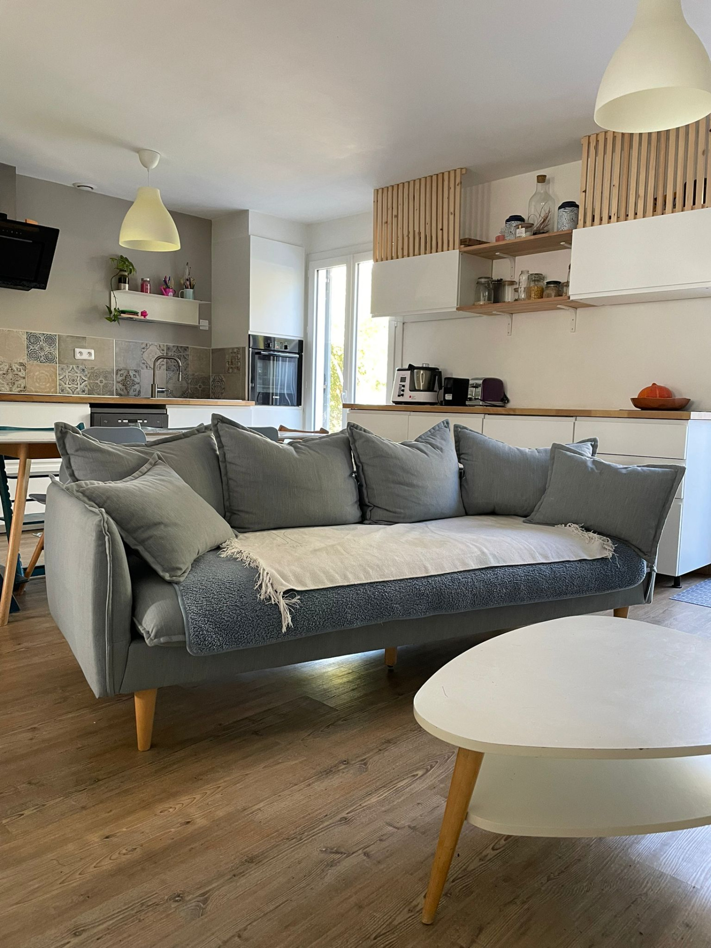 La pièce de vie est ouverte sur une cuisine aménagée et équipée avec accès direct sur le jardin. la maison comporte aussi un wc séparé, une salle d'eau (douche à l'italienne), une buanderie, un garage aménagé avec grenier.