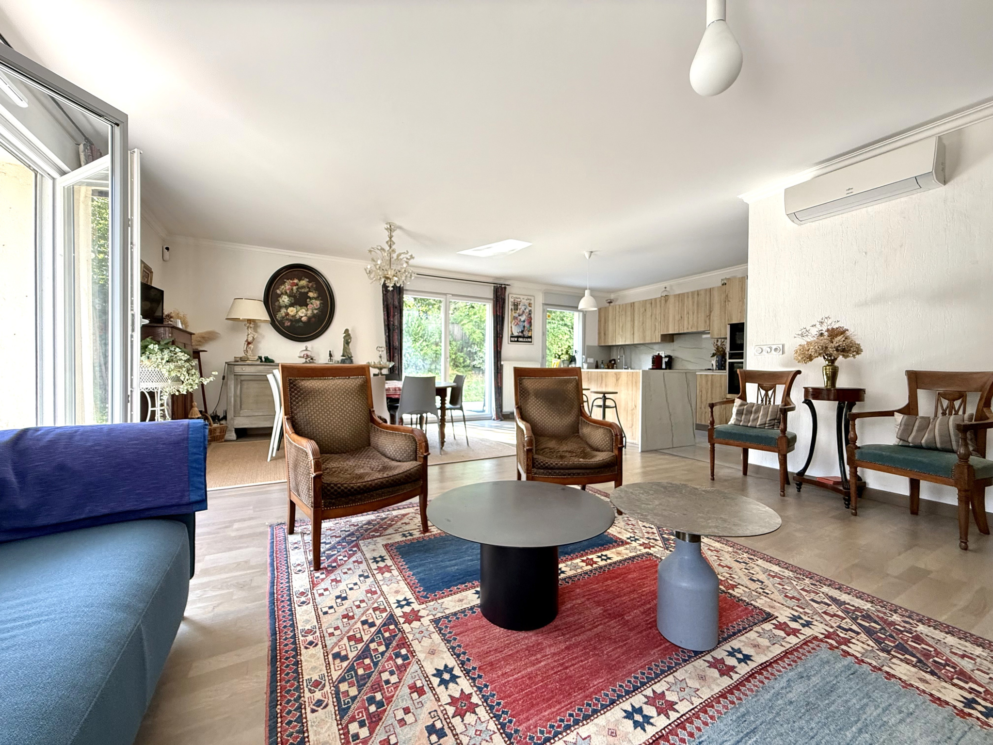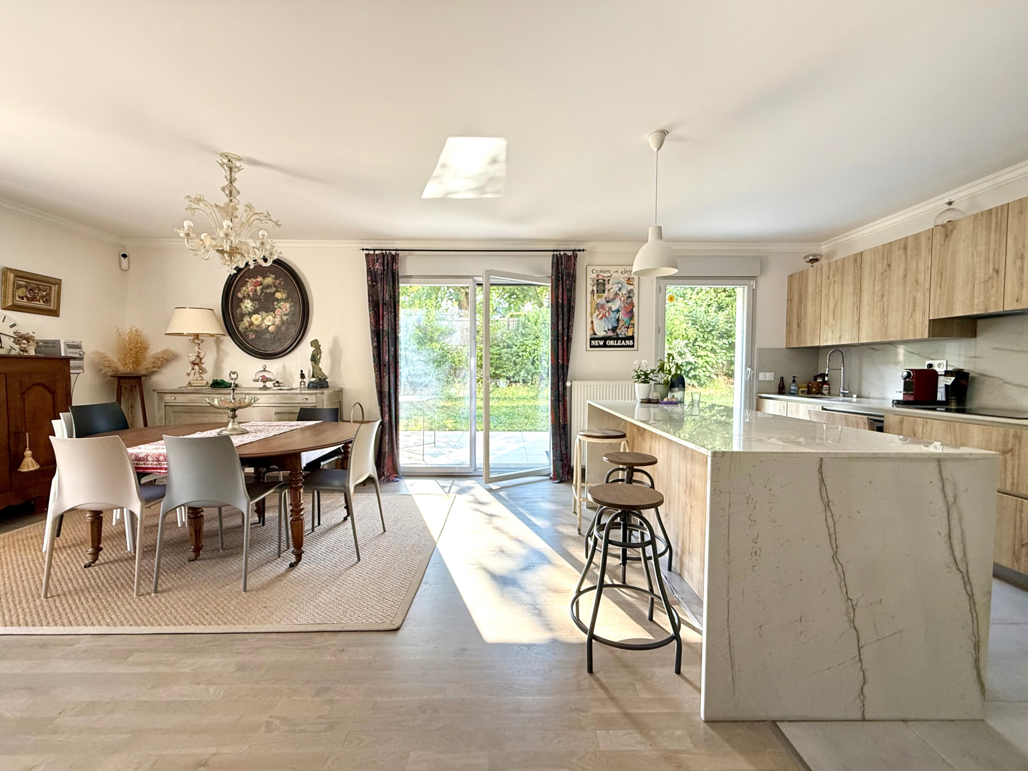 Bel espace de vie convivial avec cuisine récente équipée, trois chambres dont une avec dressing, deux salles d'eau, deux wc, espace bureau ou coin lecture, buanderie.