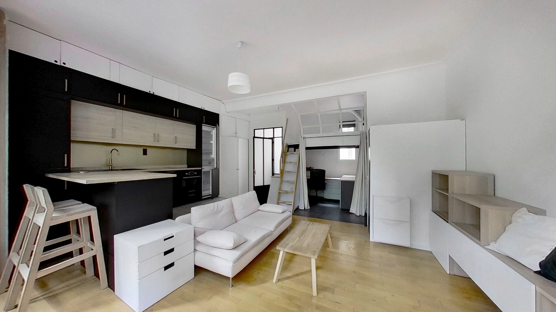 Ce studio est composé d'une entrée, un séjour cuisine, une mezzanine, une salle d'eau avec WC ainsi qu'un coin bureau et plusieurs rangements.