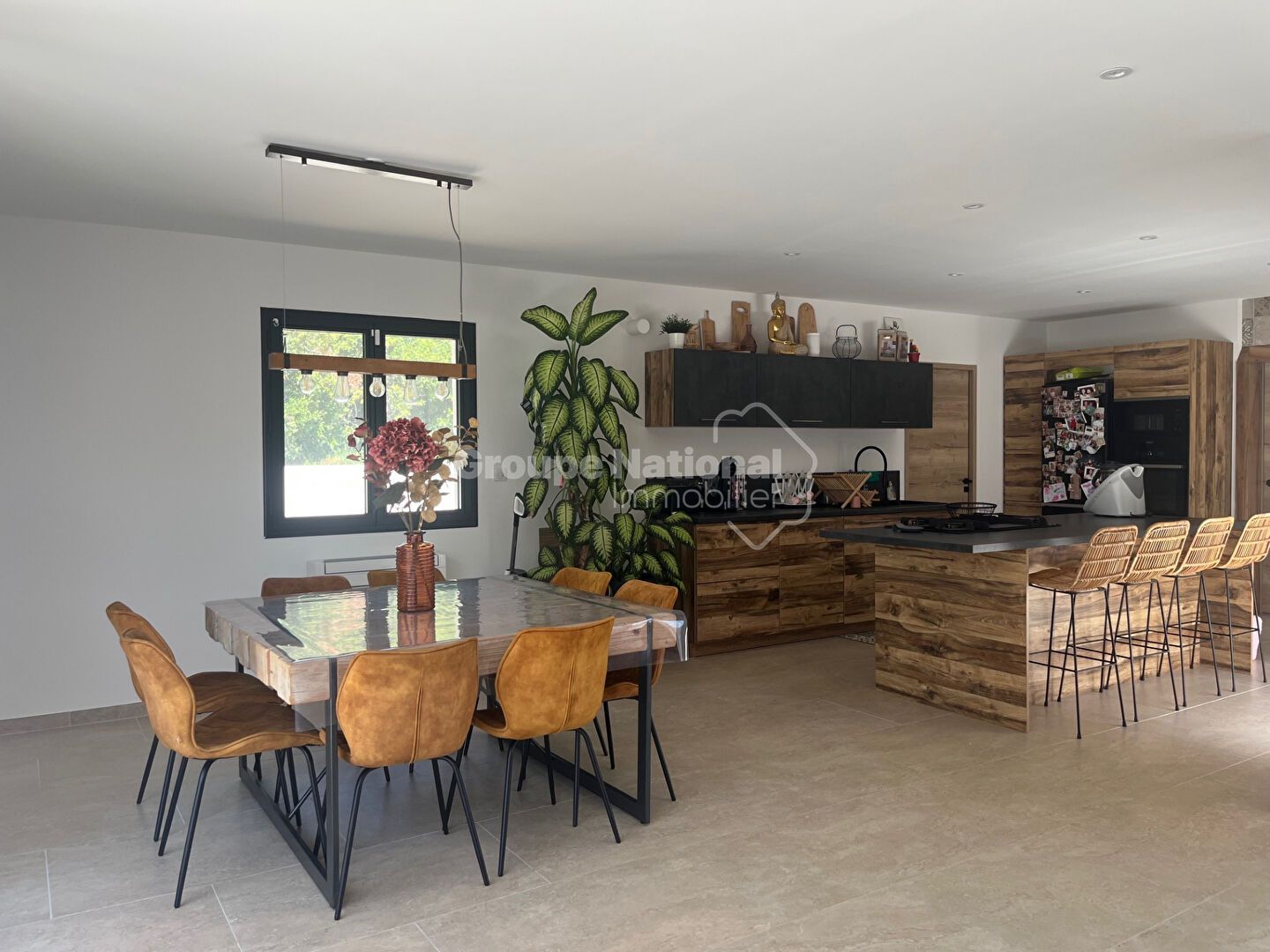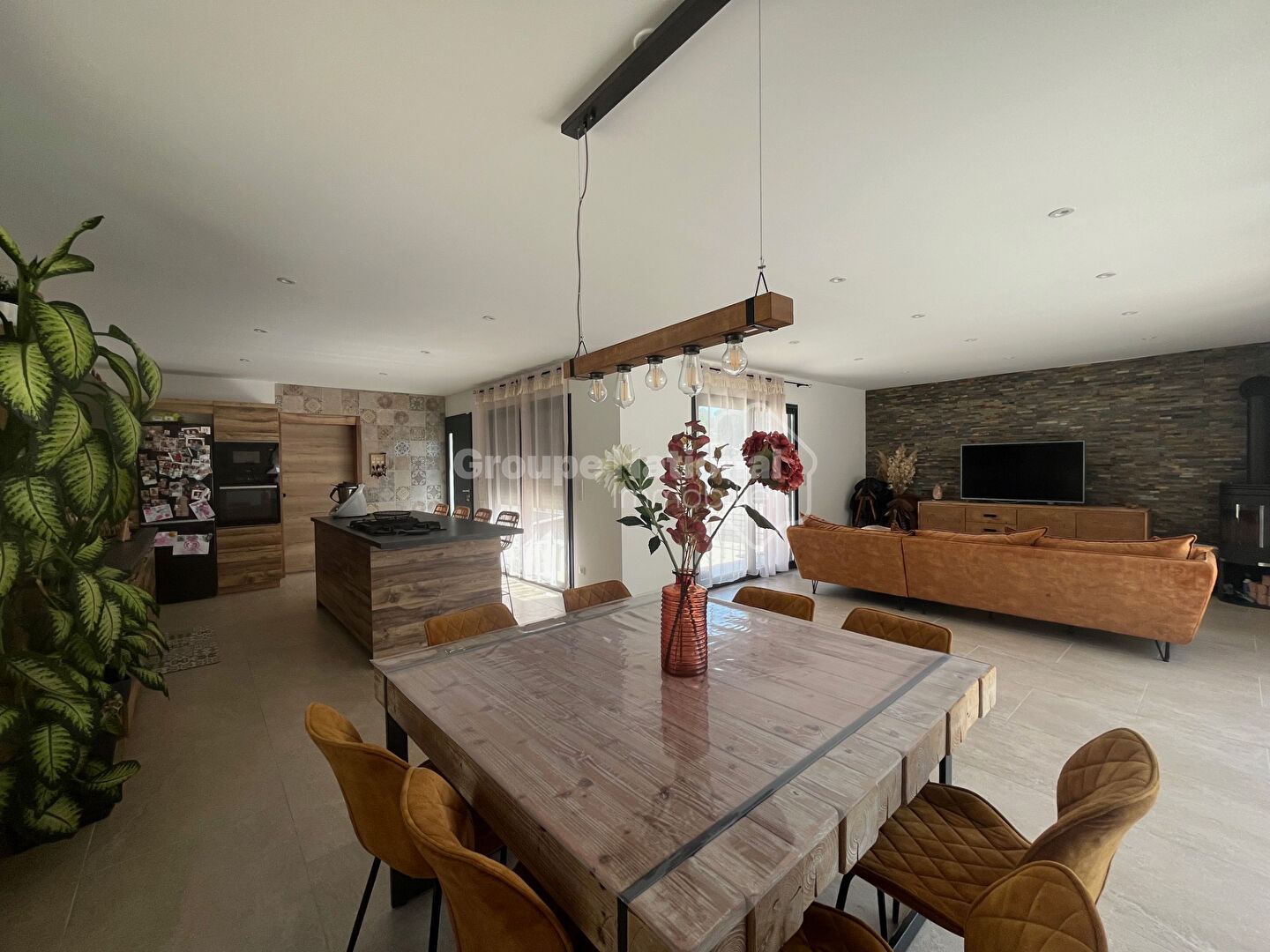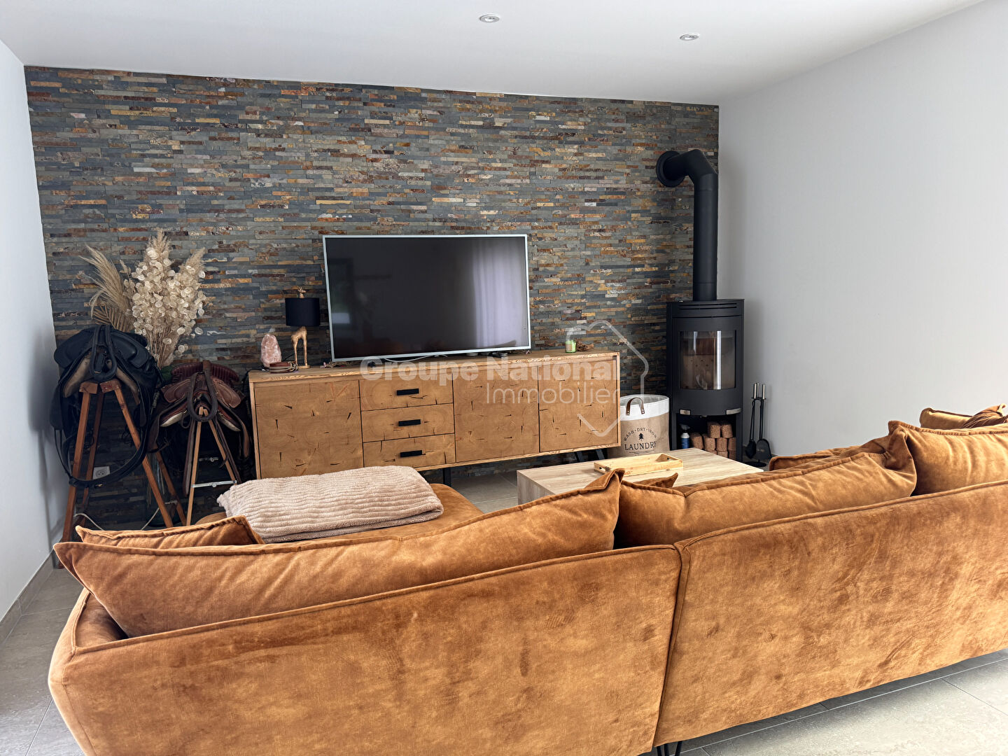 Vaste pièce de vie d'environ 60 m2, lumineuse et chaleureuse comprenant cuisine entièrement équipée ouverte sur séjour avec poêle, 3 chambres, salle d'eau avec douche à l'italienne, dressing, buanderie et garage.