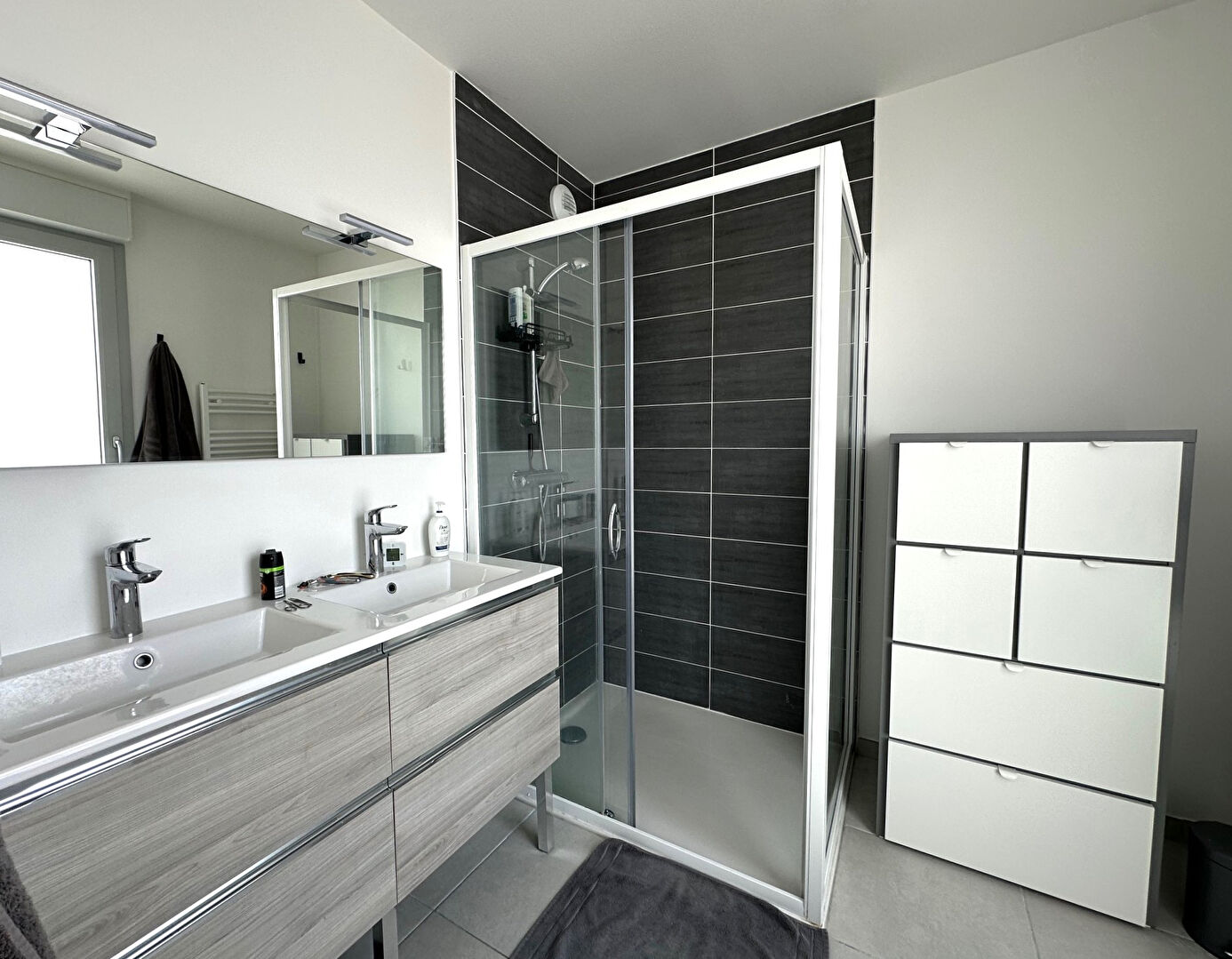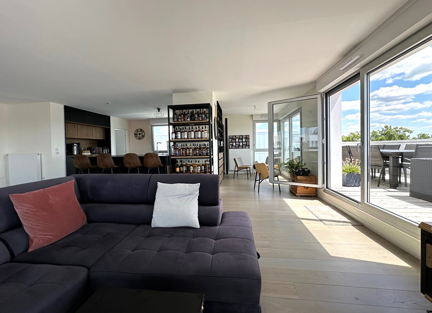 Dès l'entrée, vous serez charmé par le magnifique et lumineux salon séjour avec sa cuisine américaine entièrement équipée s'ouvrant sur la très belle terrasse plein sud sans vis à vis , un cellier, et 3 chambres dont deux, en suite, dotées chacune d'une salle de douche équipée et de rangements