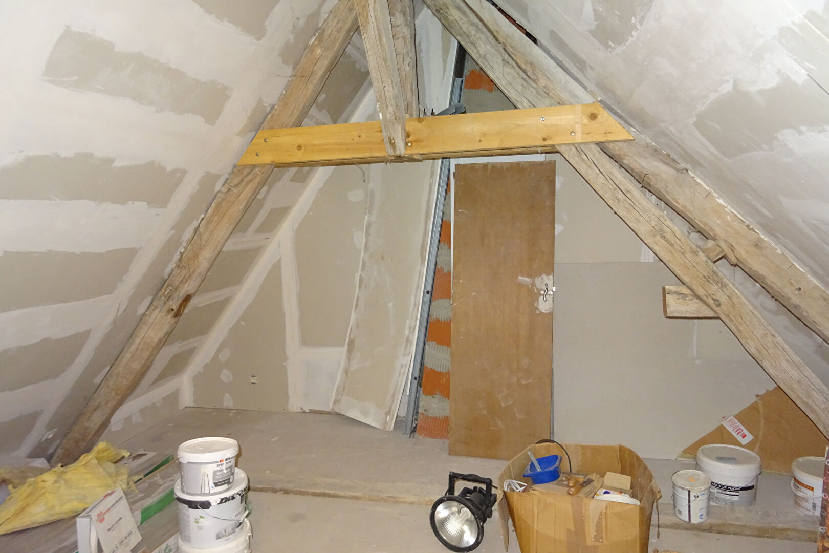 Maison comprenant au rdc : cuisine ouverte sur séjour-salon, chambre, sde+wc. A l'étage : palier, chambre, bureau, une pièce à finir. Menuiseries en pvc. Terrain non attenant de 460 m² avec petit garage situé à moins de 10m de la maison.