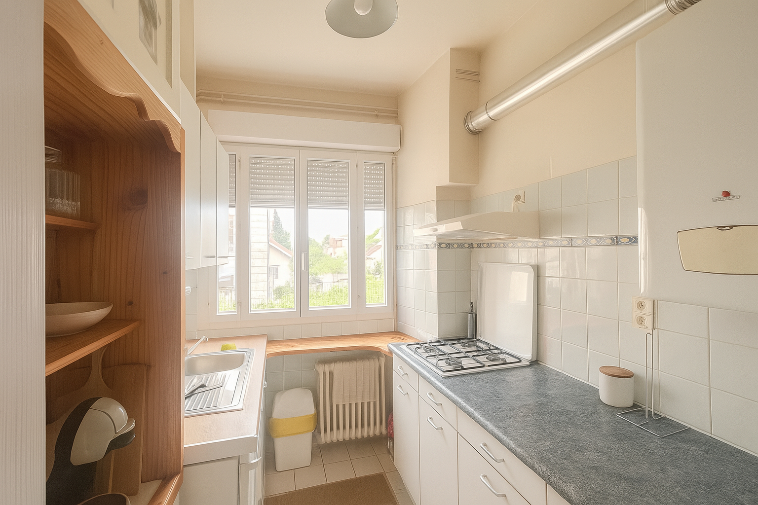 L'appartement se compose d'une entrée, d'un vaste séjour lumineux, d'une cuisine séparée, de deux chambres et d'une cave en sous-sol. Il bénéficie également d'une situation proche de toutes les commodités : commerces, écoles, transports,